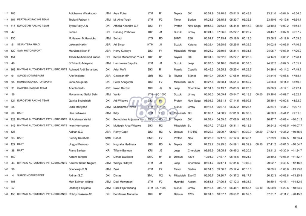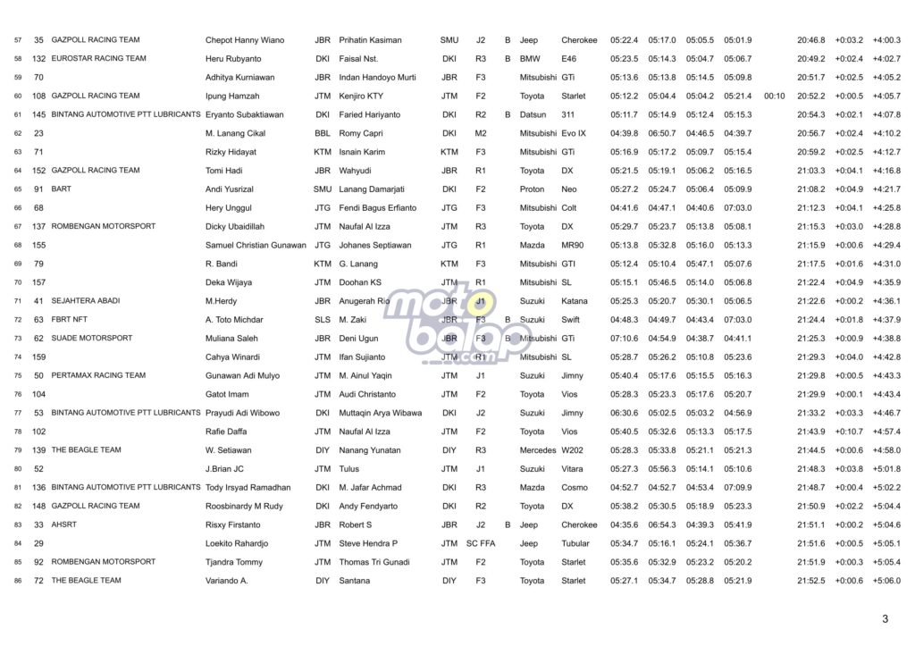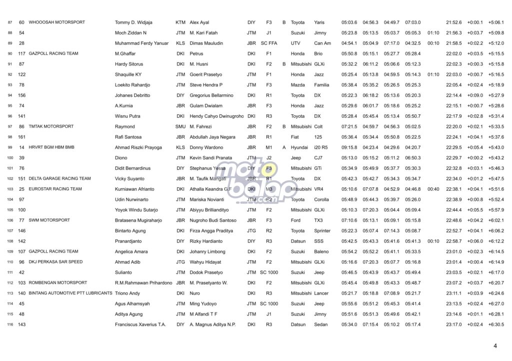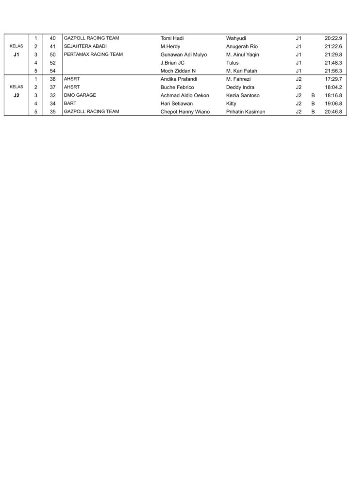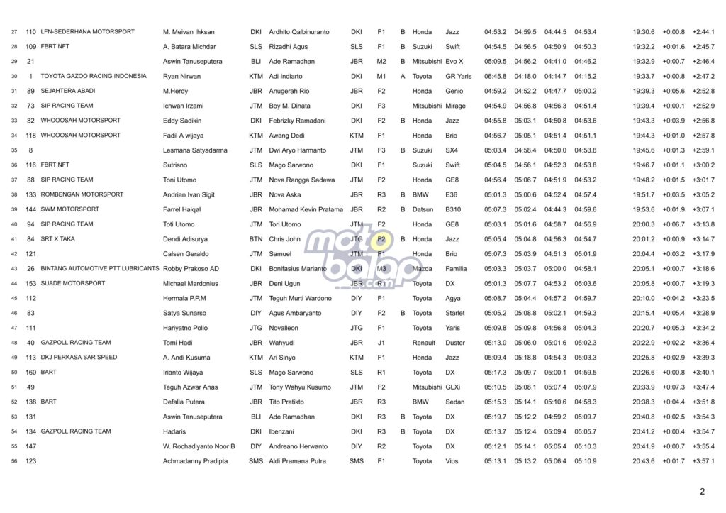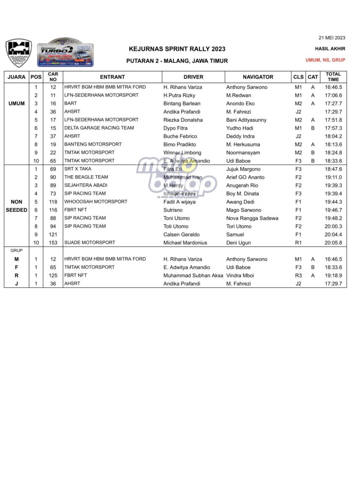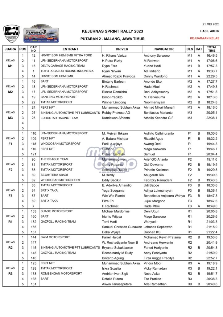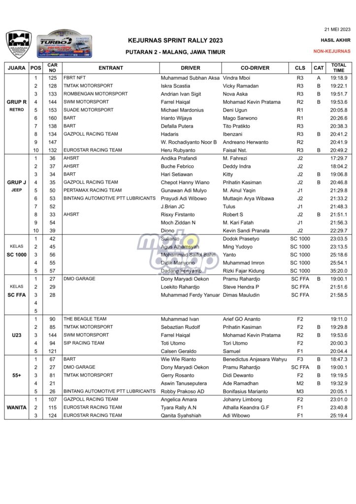 Dari kesulurahan kelas yang dilombakan, di bawah ini merupakan Hasil Juara Kejurnas Sprint Rally 2023 Put.2 Malang adalah sebagai berikut: