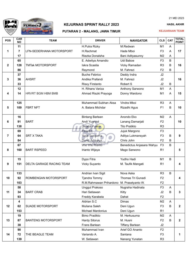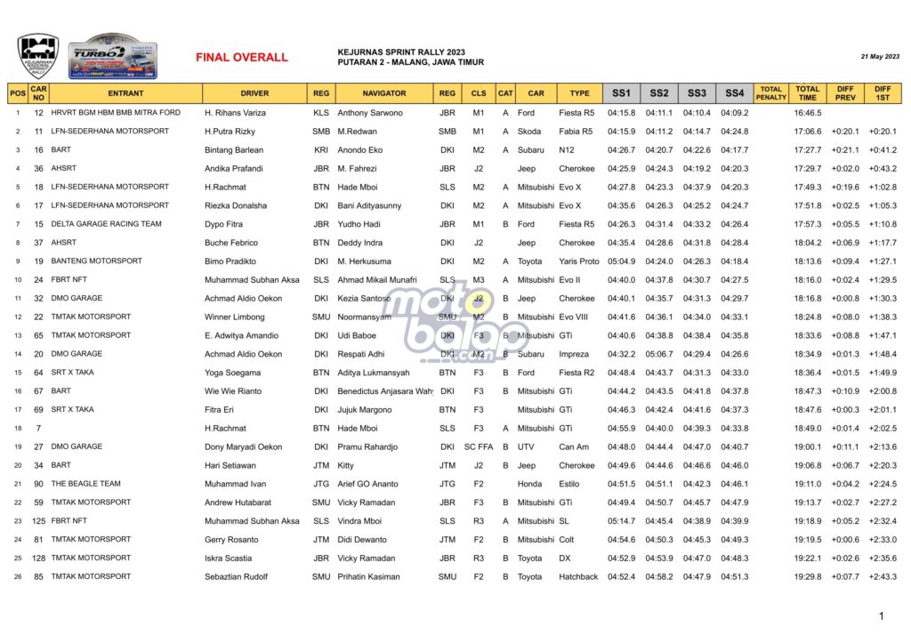 MOTOBALAP.COM – Kejuaraan Nasional Balap Mobil bertajuk Kejurnas Sprint Rally 2023putaran 2 berlangsung sengit di Malang, Jawa Timur, Minggu (21/05/2023).