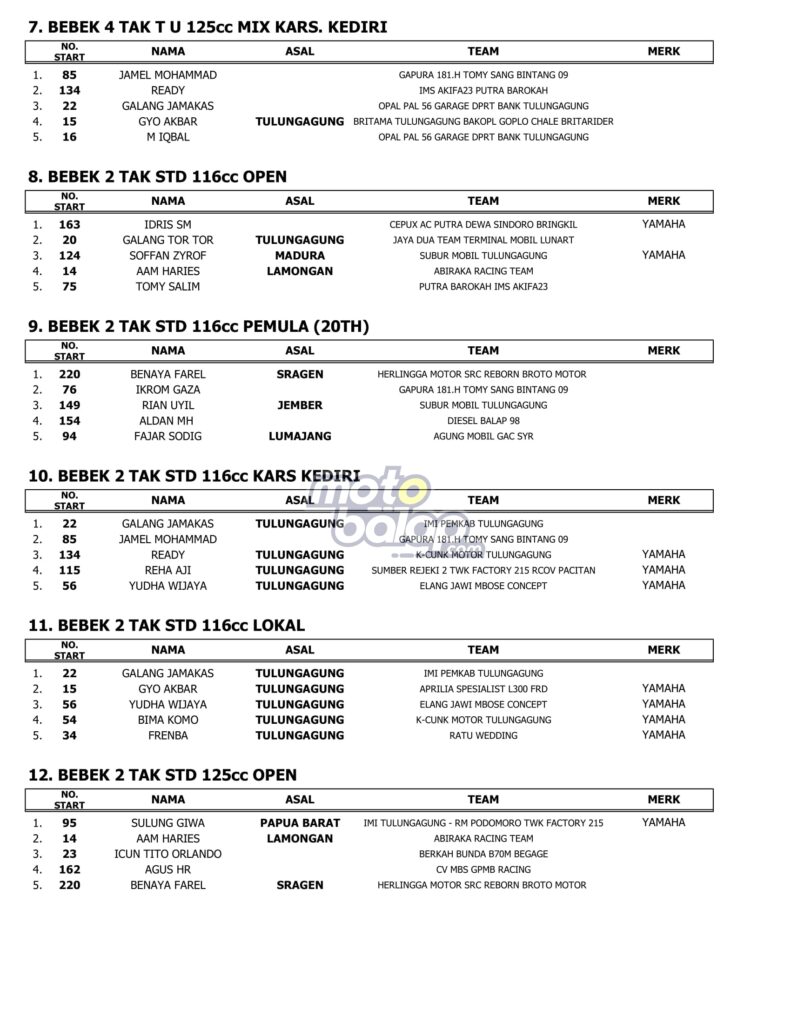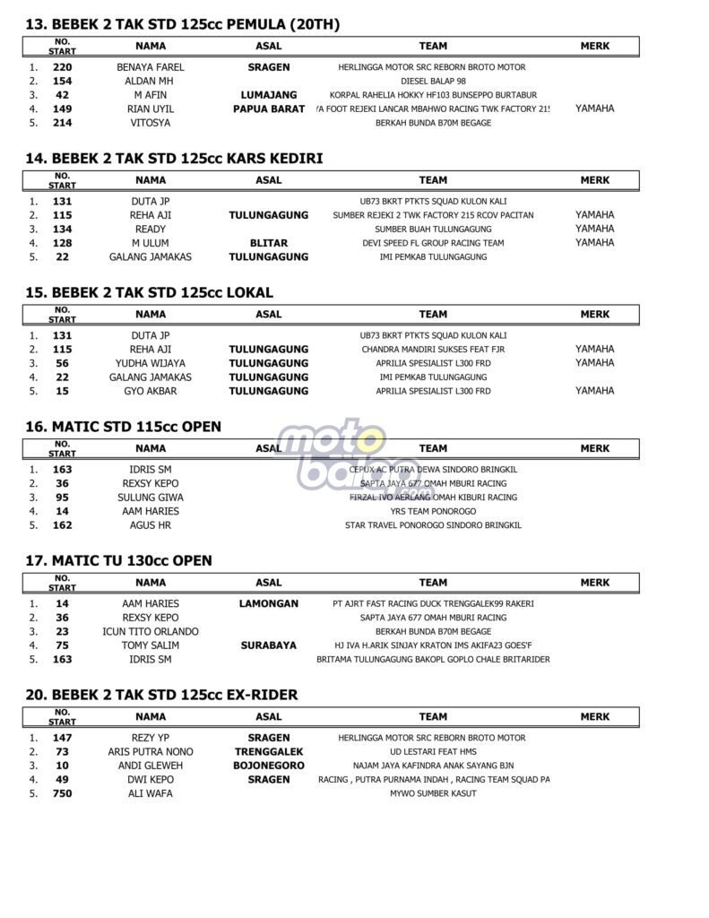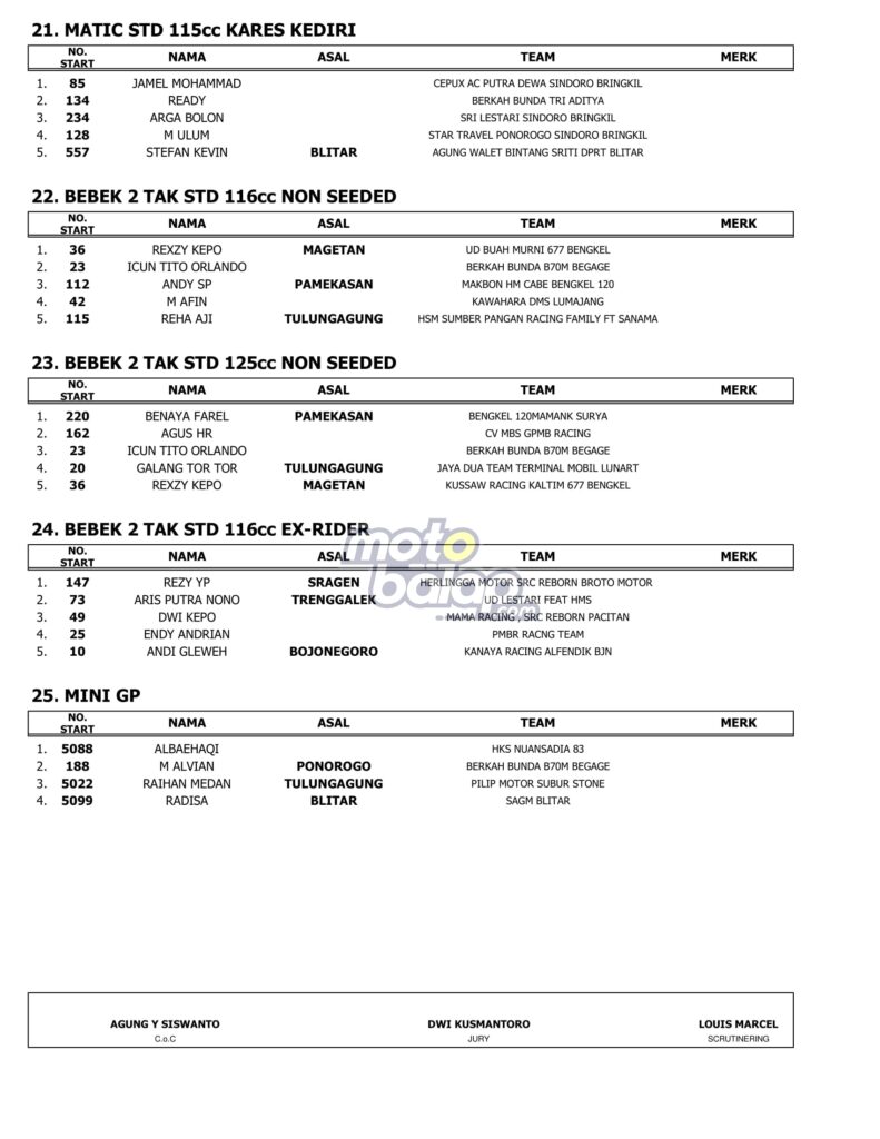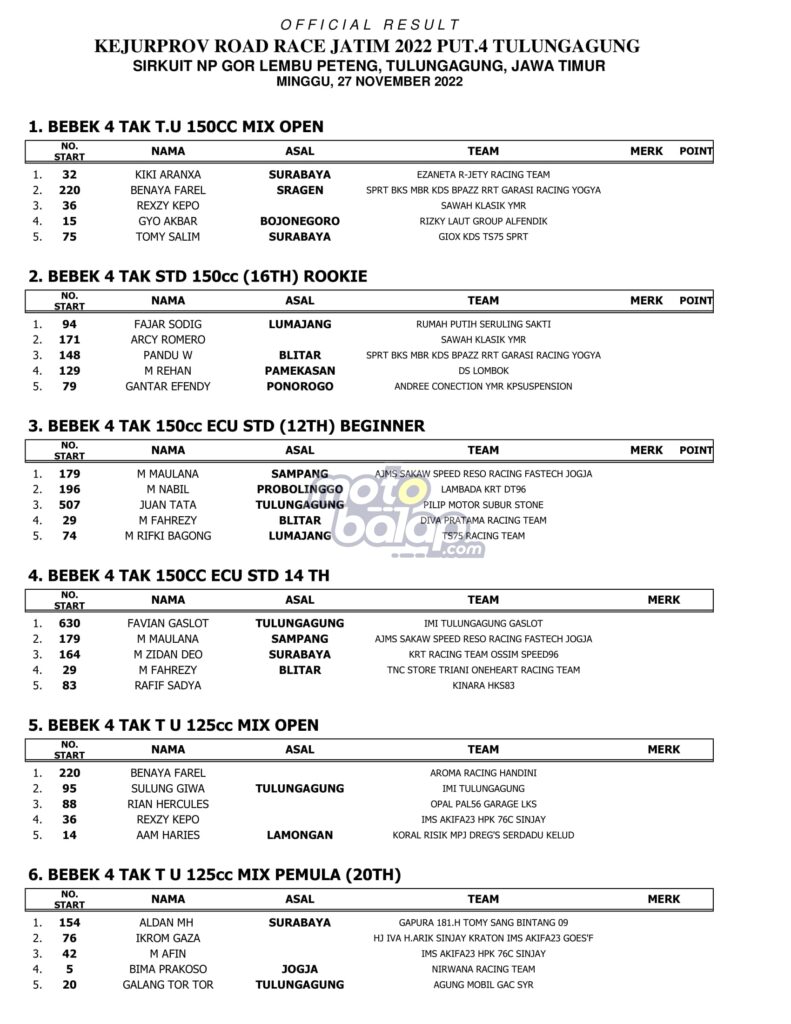 Di Bawah ini merupakan Hasil Juara Kejurprov Road Race Jatim 2022 Put.4 Tulungagung adalah sebagai berikut: