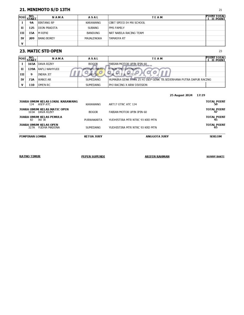 MOTOBALAP.COM- Berikut Ini Adalah Hasil Juara Merdeka 79 Grasstrack yang berlangsung disirkuit Al Amin Tegal Landak Cilamaya Karawang (25/8).