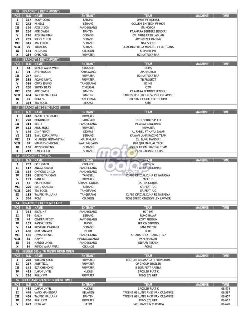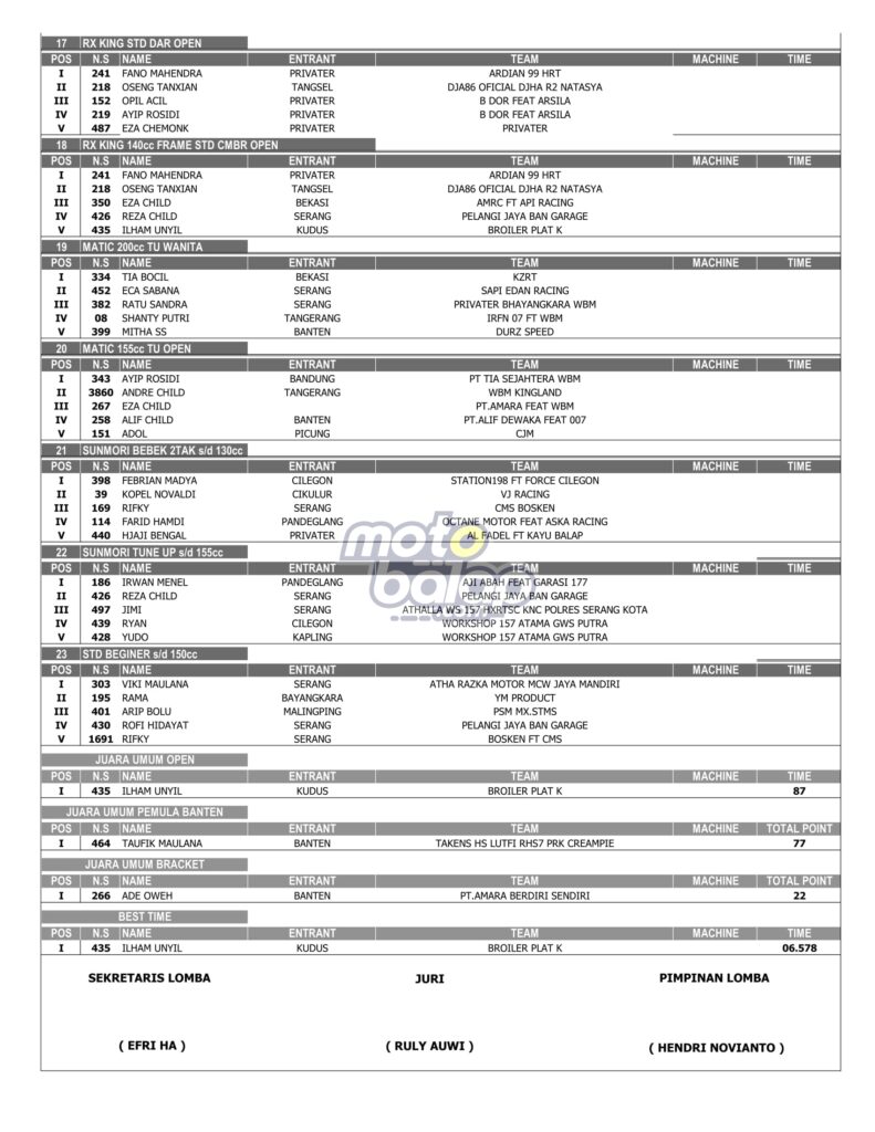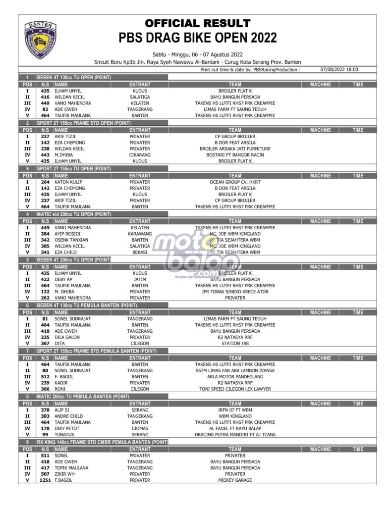 MOTOBALAP.COM – Berikut merupakan hasil juara PBS Drag Bike Open 2022 yang dihelat di Sircuit Boru Kp3b Jln. Raya Syeh Nawawu Al-Bantani – Curug Kota Serang Prov. Banten, Sabtu-Minggu (06-07/08/2022) adalah sebagai berikut: