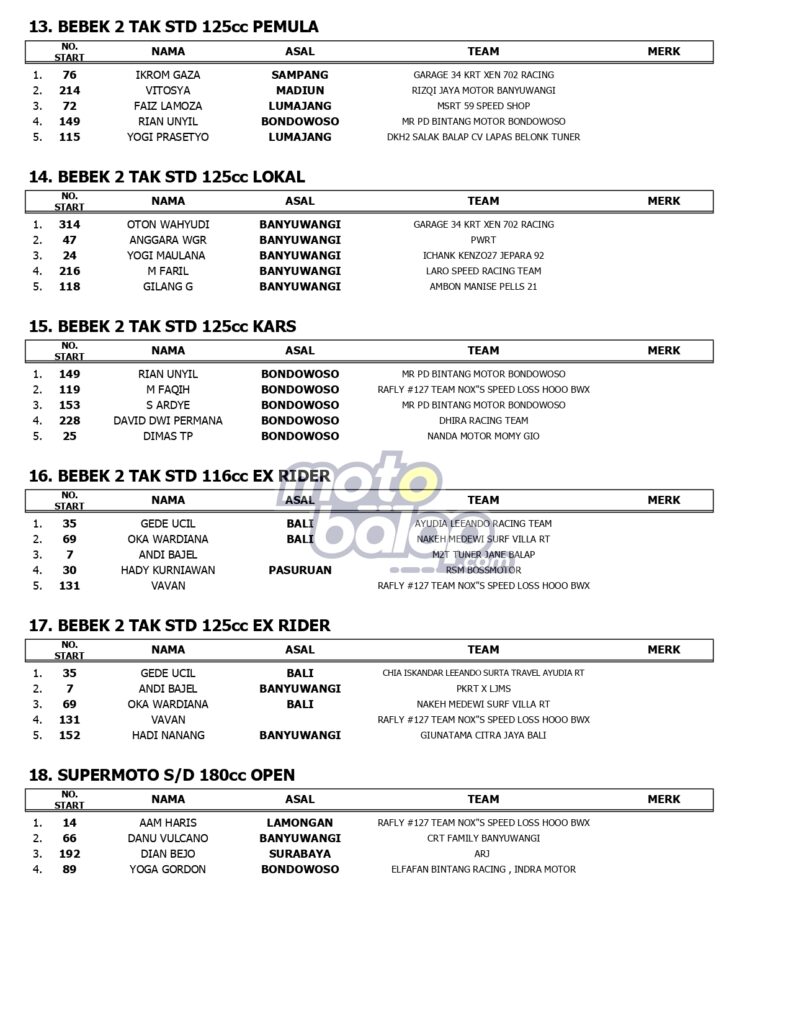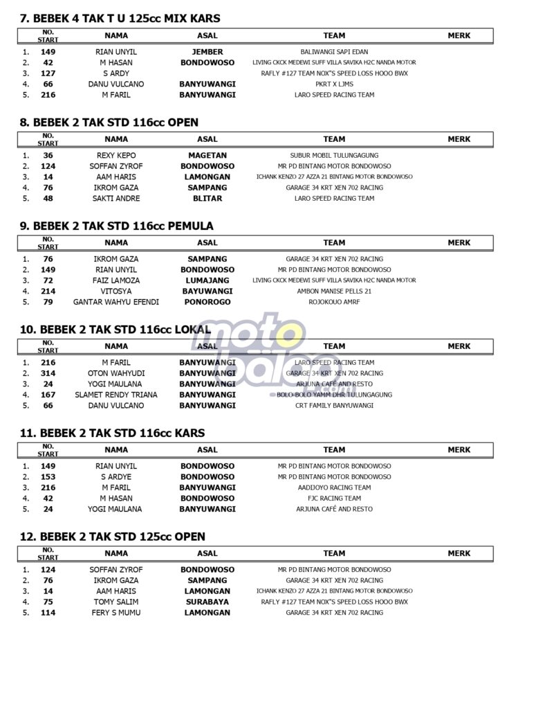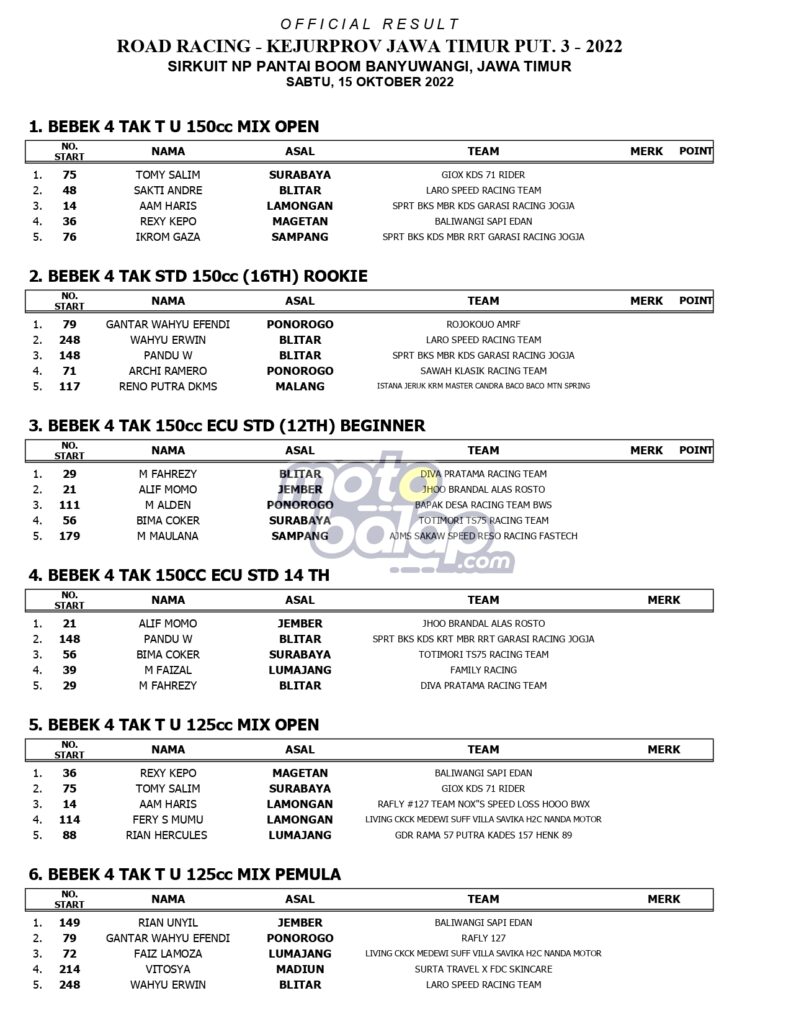 Dari keseluruhan race yang dilombakan, di bawah ini merupakan Hasil Juara Road Racing Kejurprov Jawa Timur 2022 Putaran 3 adalah sebagai berikut: