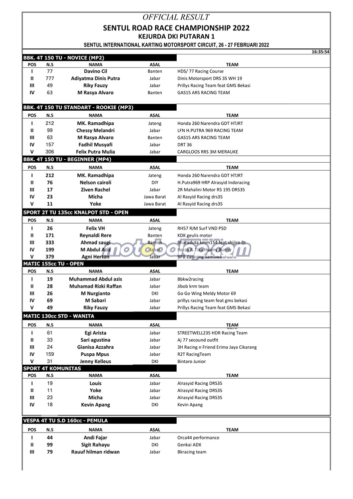 Hasil Juara Sentul Road Race Championship Putaran 1, MOTOBALAP.COM – Ajang balap motor bertajuk Sentul Road Race Championship 2022 Kejurda IMI DKI putaran perdana berlangsung sukses dengan kehadiran 250 starter di Sentul Karting International Circuit, Minggu (27/02/2022).