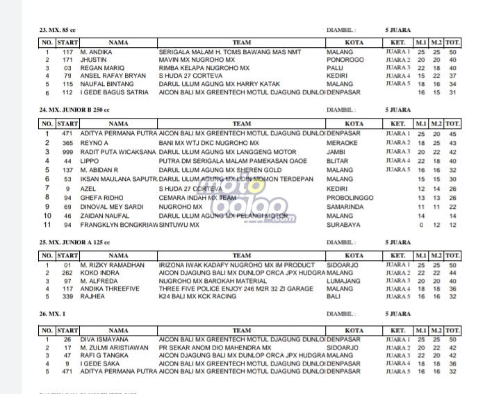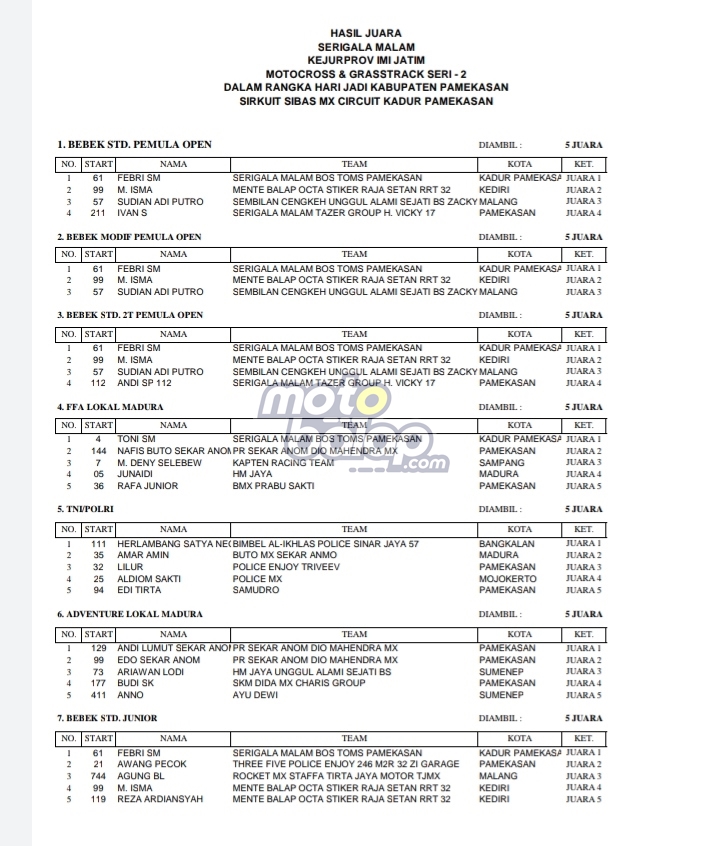 Di Bawah ini merupakan Hasil Juara Serigala Malam Kejurprov IMI Jatim Motocross & Grasstrack seri 2 Pamekasan adalah sebagai berikut: