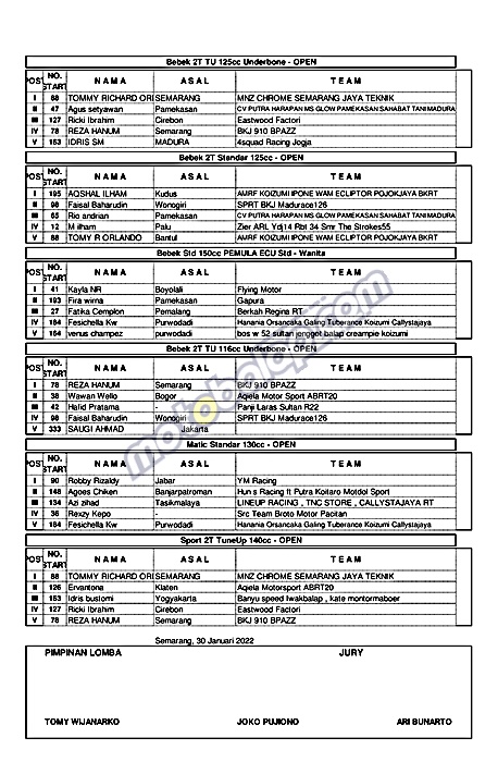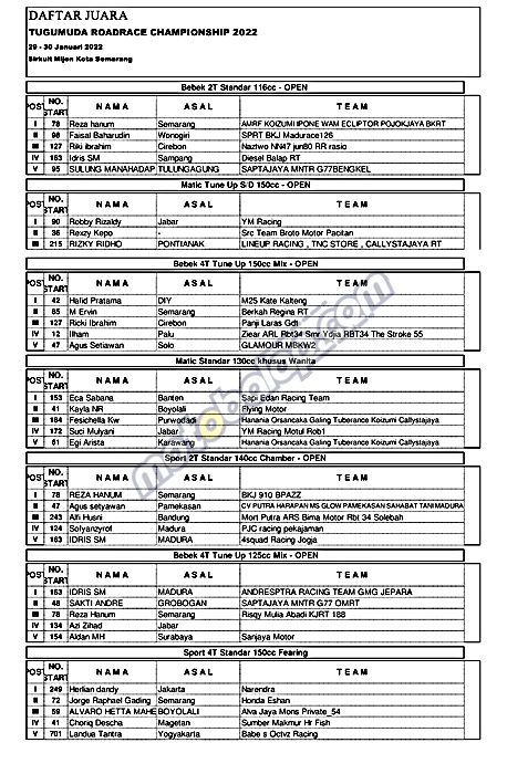 Di bawah ini merupakan hasil juara semua kelas kategori Open Tugu Muda Road Race Championship 2022: