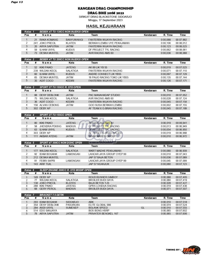 Dari keselurahan kelas yang dilombakan, di bawah ini Hasil Kangean Drag Championship Drag Bike 201m 2023 adalah sebagai berikut: