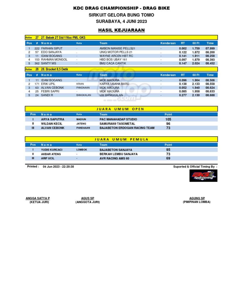Dari kesulurahan kelas yang dilombakan, di bawah ini merupakan Hasil Kangean Drag bike Championship 2023 adalah sebagai berikut: