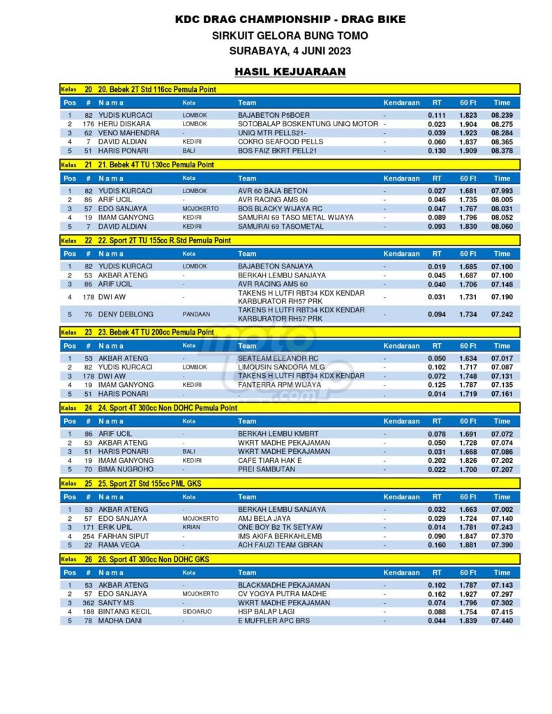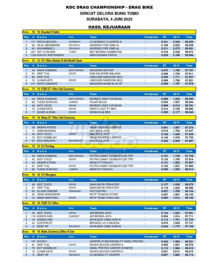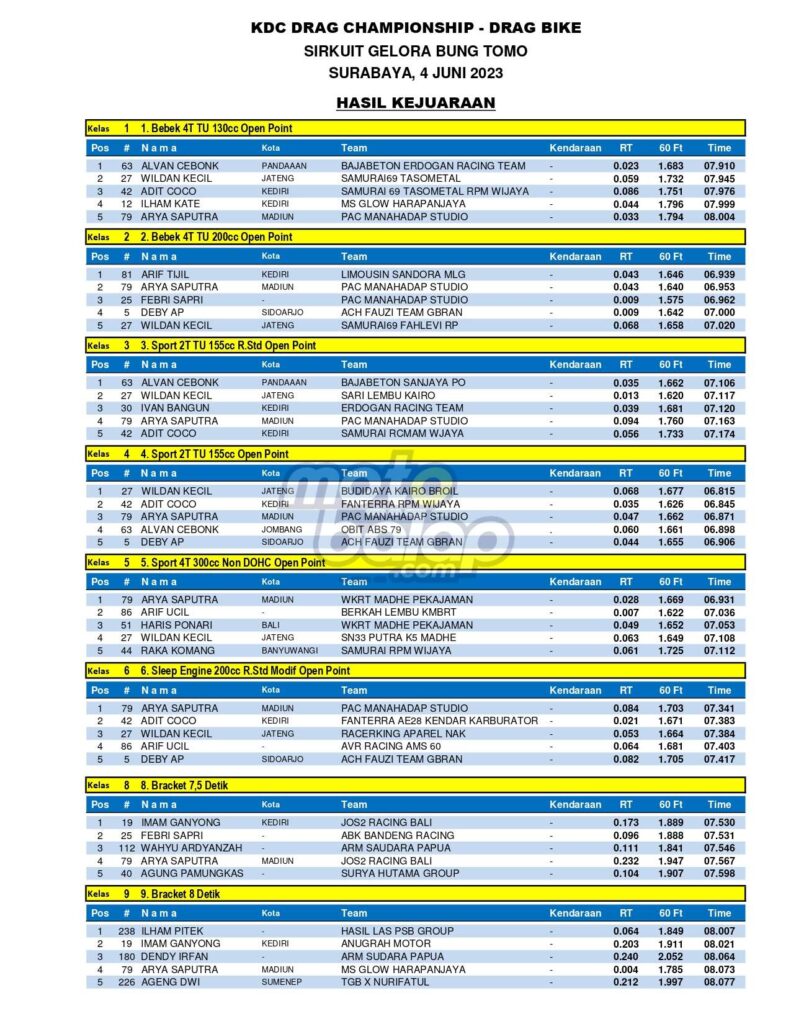 Dari kesulurahan kelas yang dilombakan, di bawah ini merupakan Hasil Kangean Drag bike Championship 2023 adalah sebagai berikut: