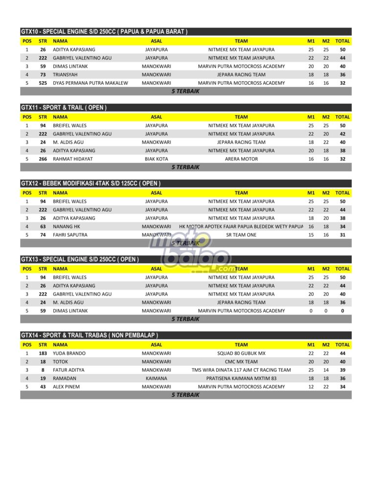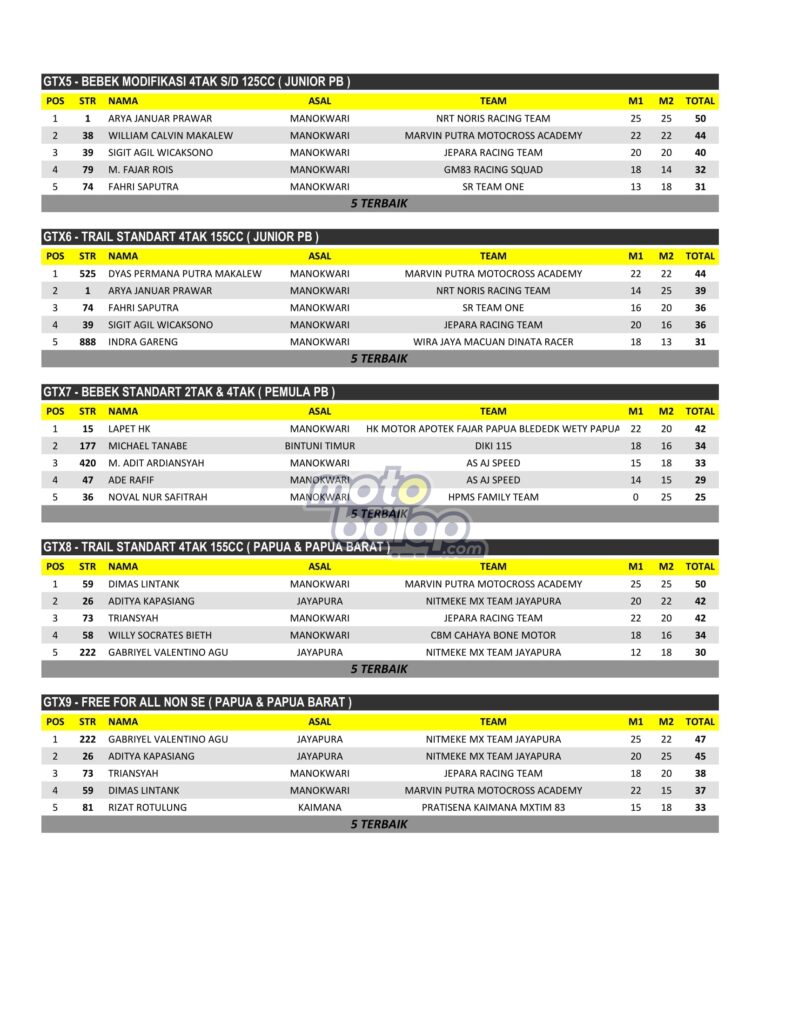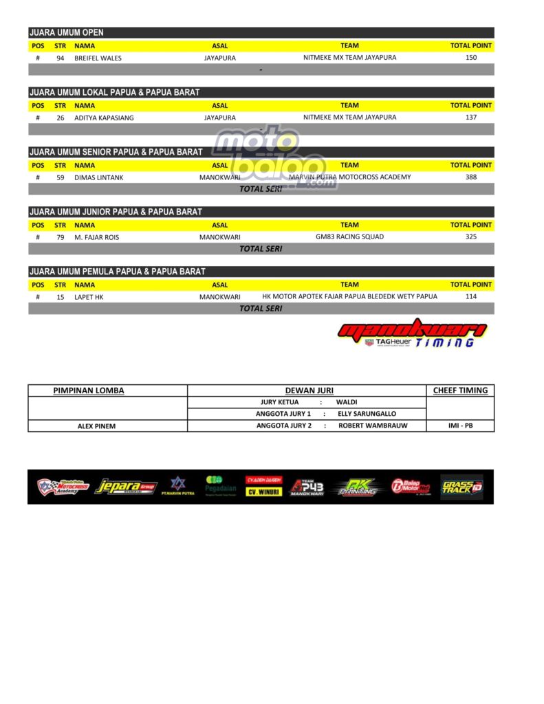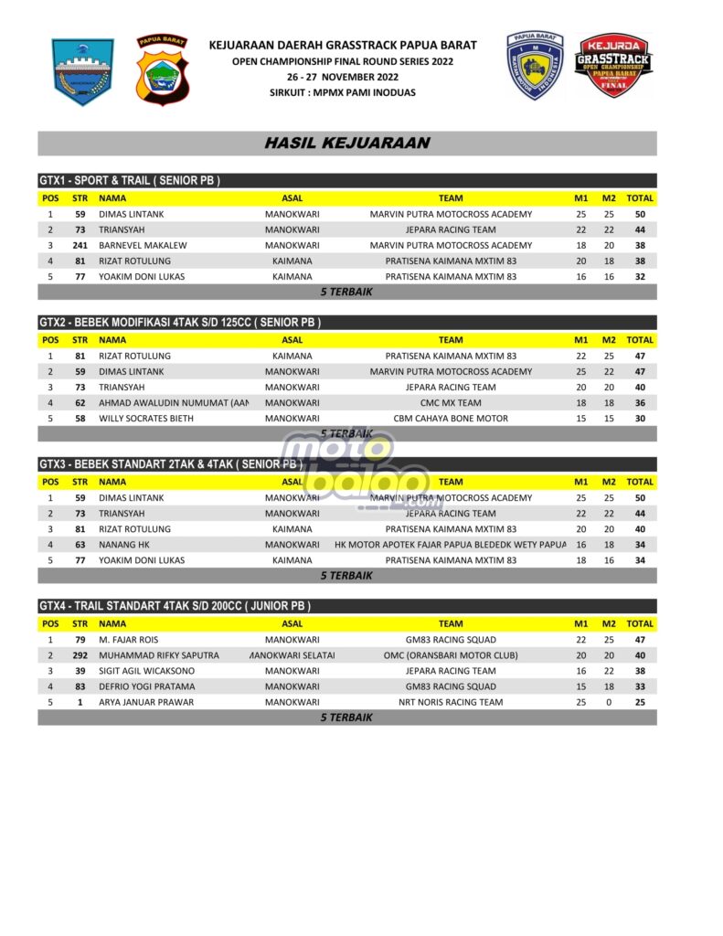 Di Bawah ini merupakan Hasil JKejuaraan Daerah Grasstrack Papua Barat Open Championship Final Round Series 2022 adalah sebagai berikut: [Fahry Fathony]