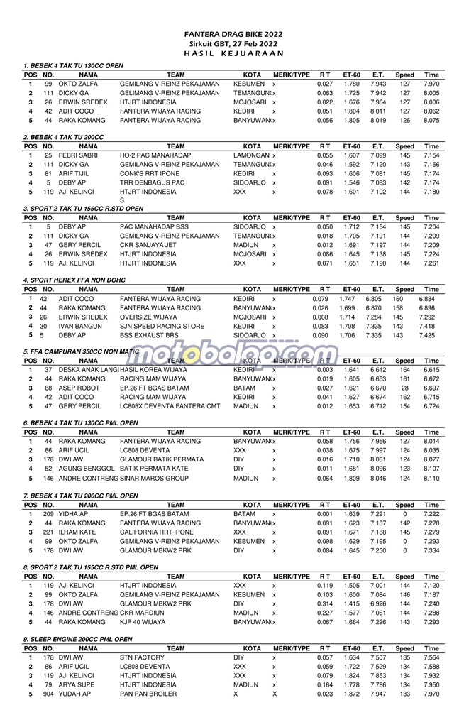Di bawah ini merupakan hasil Kejuaraan Fantera Drag Bike 2022 adalah sebagai berikut: