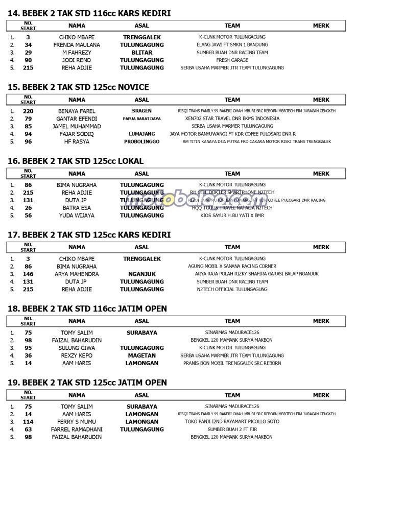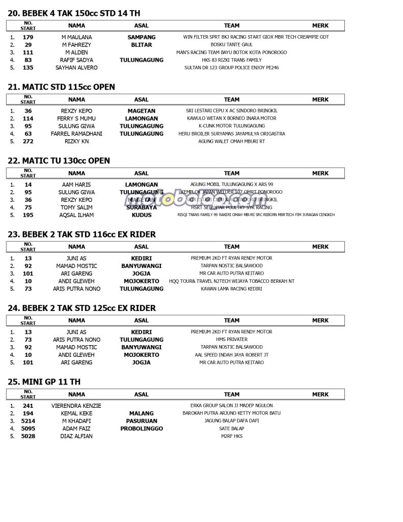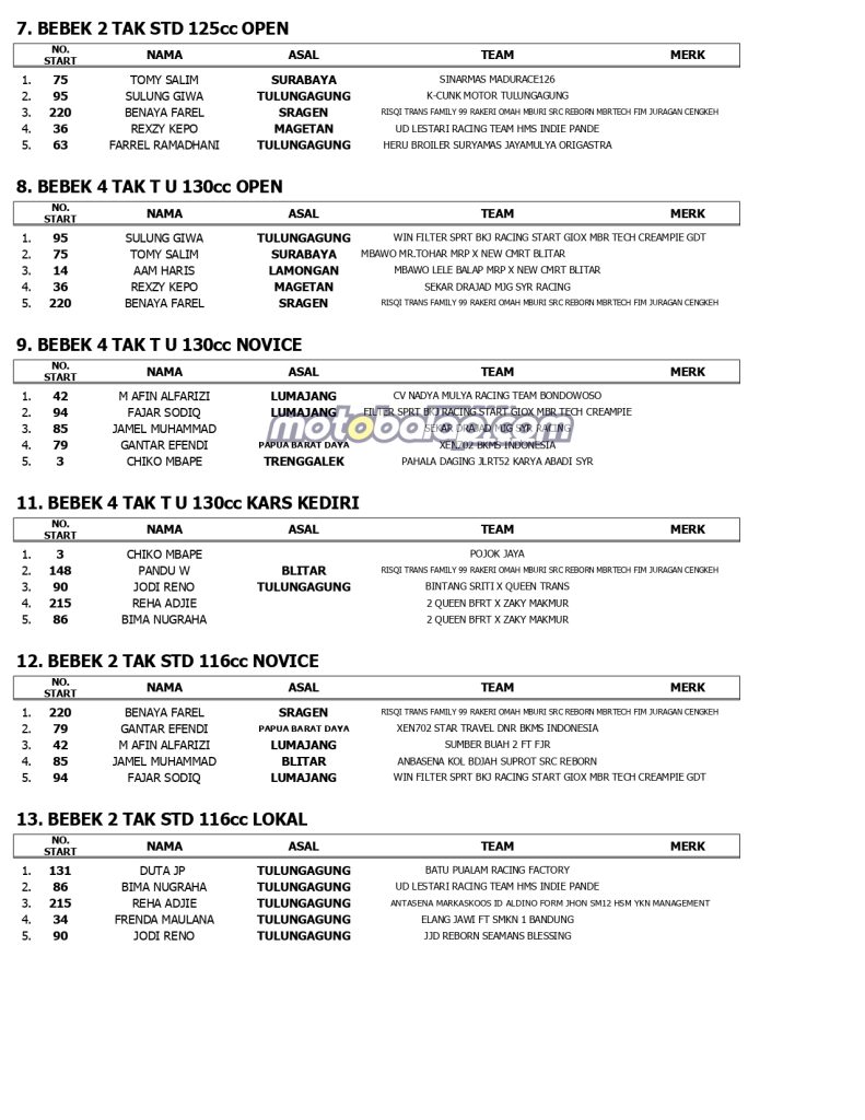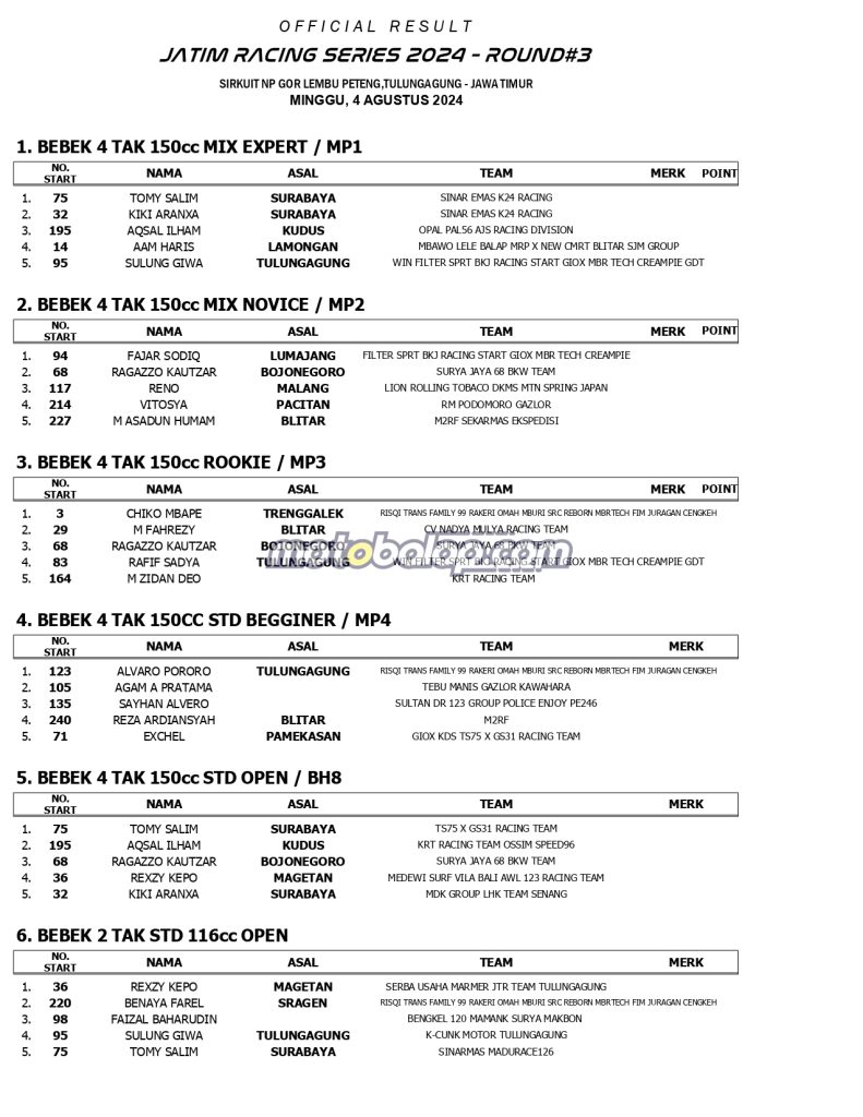 MOTOBALAP.COM- Berikut ini adalah Hasil Jatim Racing Series (Kejurprov Jatim) Putaran 3 Yang Terselenggara di Sirkuit NP. Gor Lembu Peteng Tulungagung Jawa Timur (4/8).
