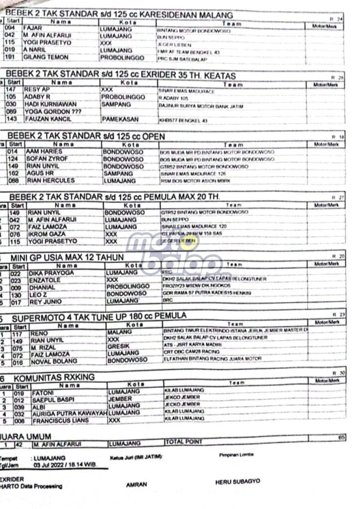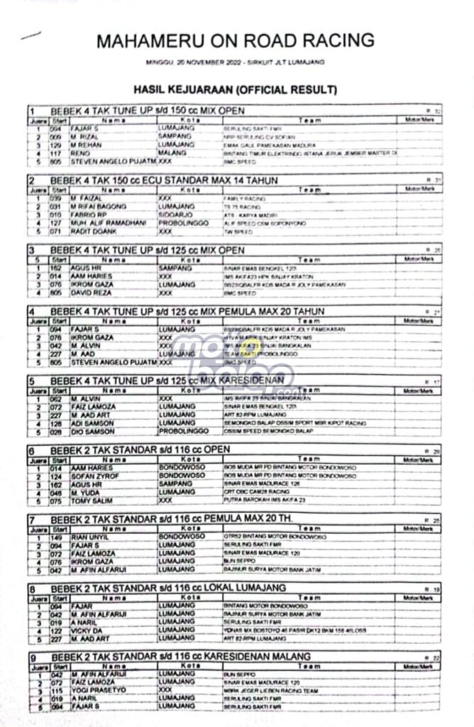 Di Bawah ini merupakan Hasil Kejuaraan Mahameru On Road Racing Lumajang adalah sebagai berikut: