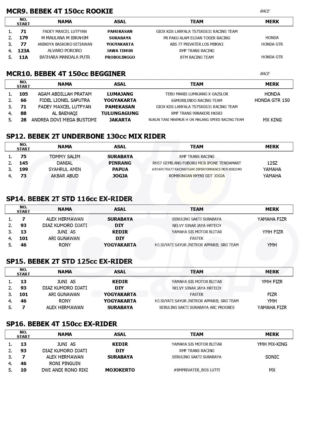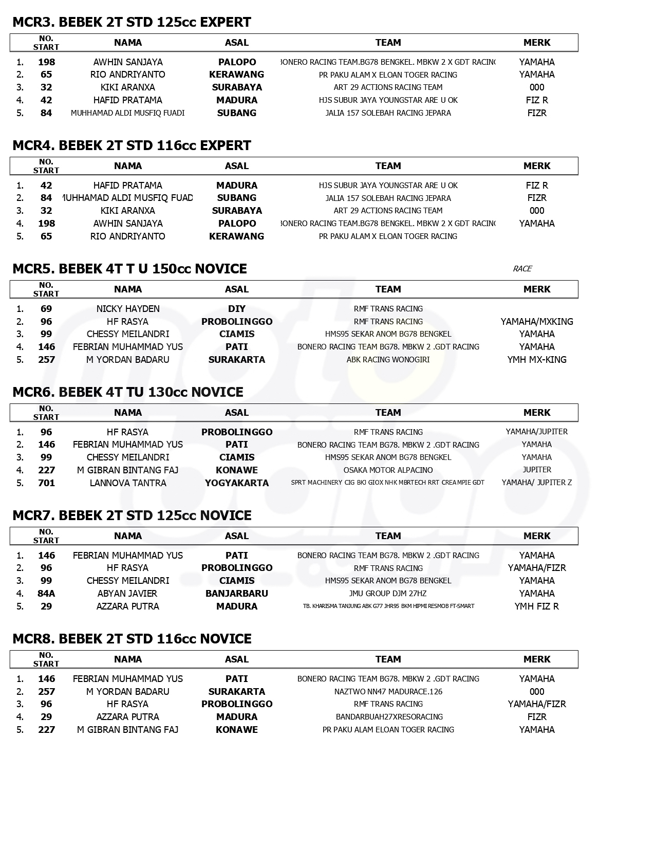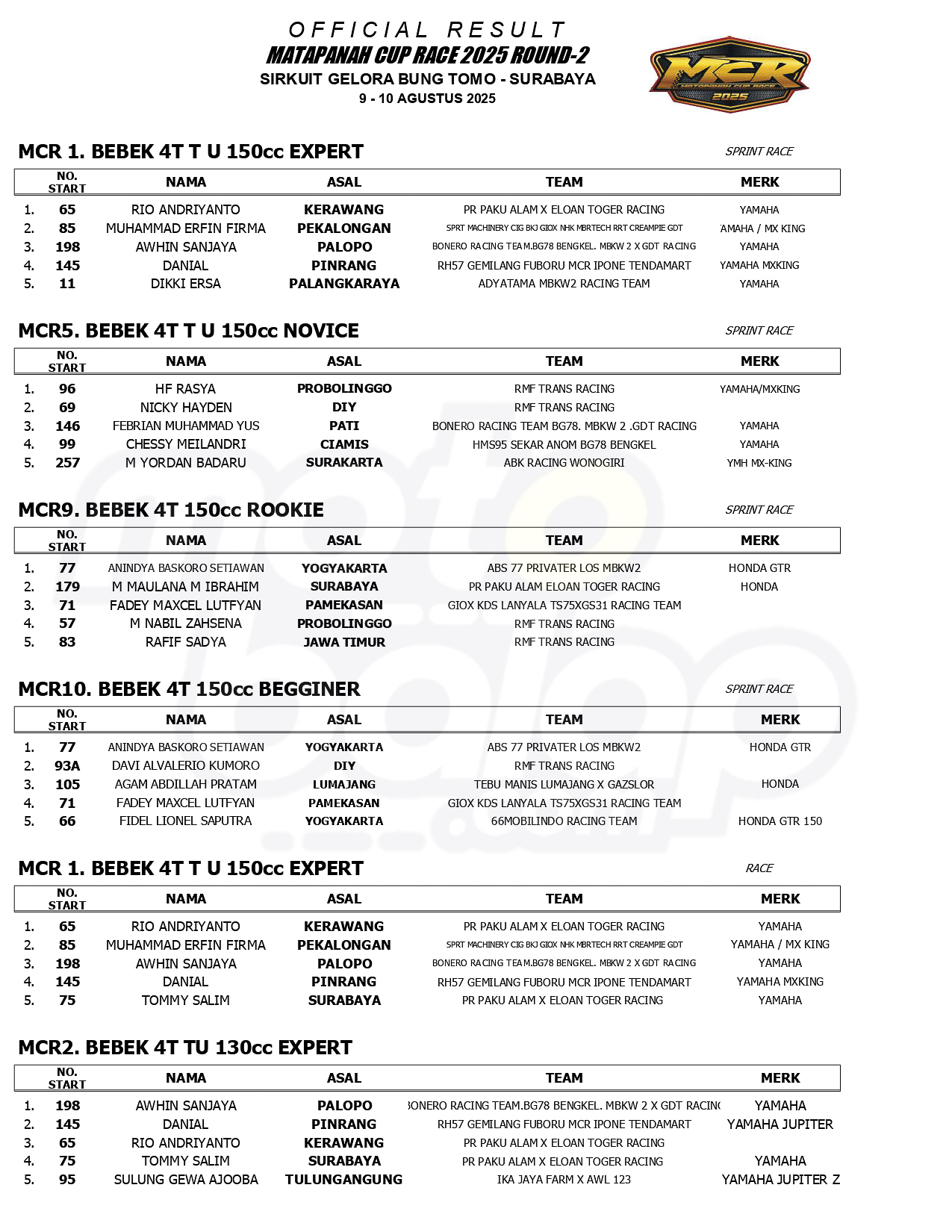 MOTOBALAP.COM – Berikut ini adalah hasil Kejuaraan Matapanah Cup Race (MCR) Putaran 2, yang berlangsung di Sirkuit Gelora Bung Tomo, Surabaya, Jawa Timur (9-10) Agustus 2025.