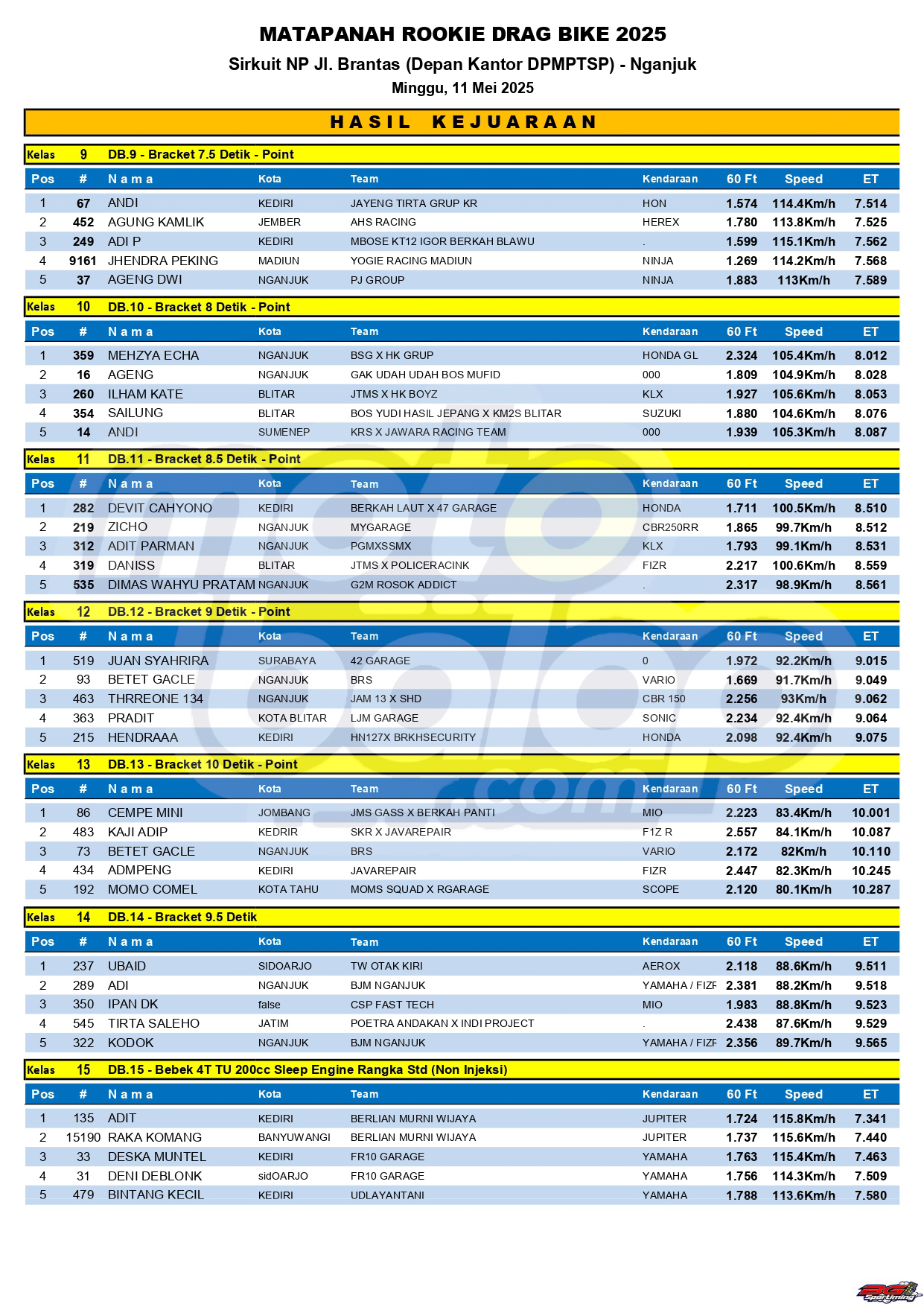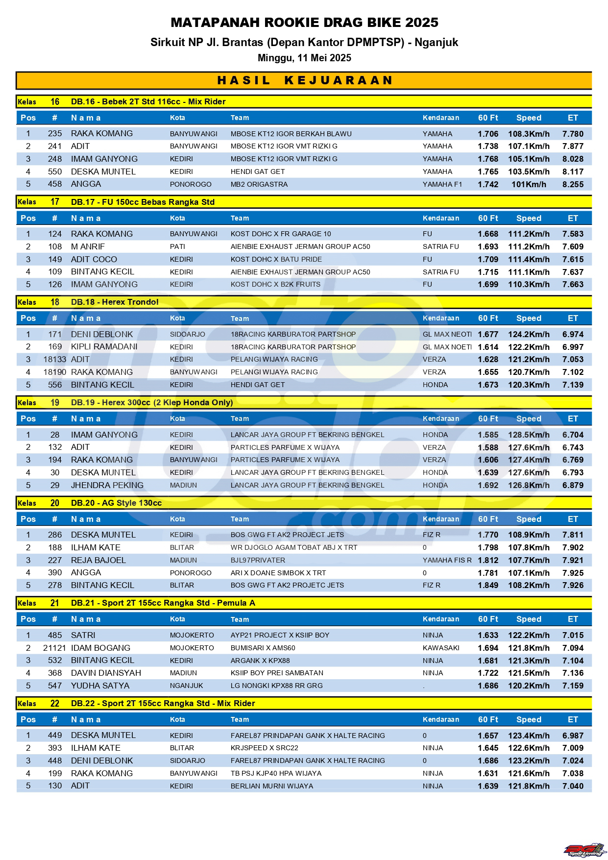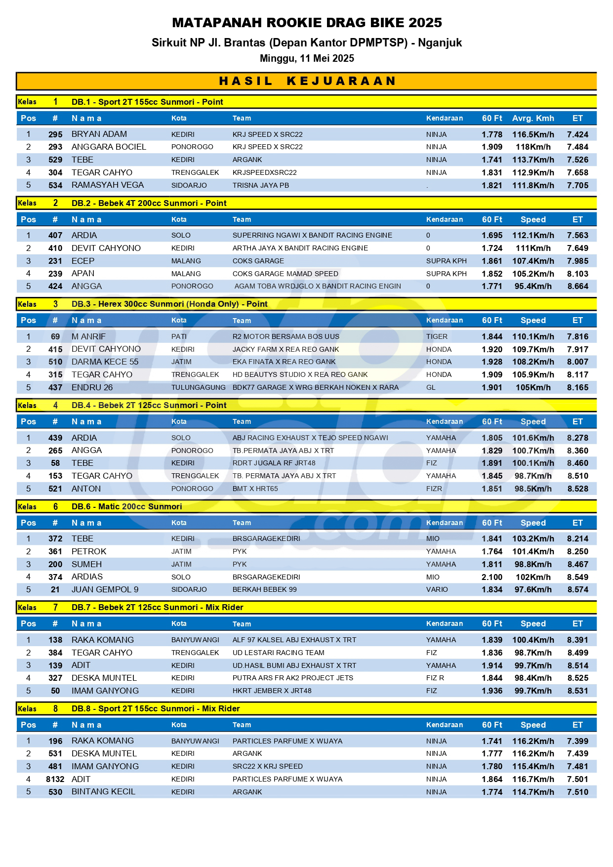 MOTOBALAP.COM Berikut ini adalah hasil kejuaraan balap lurus Matapanah Rookie Drag Bike 2025 yang berlangsung di sirkuit NP. Jln. Brantas, Nganjuk, Jawa Timur pada Minggu 11 Mei 2025.