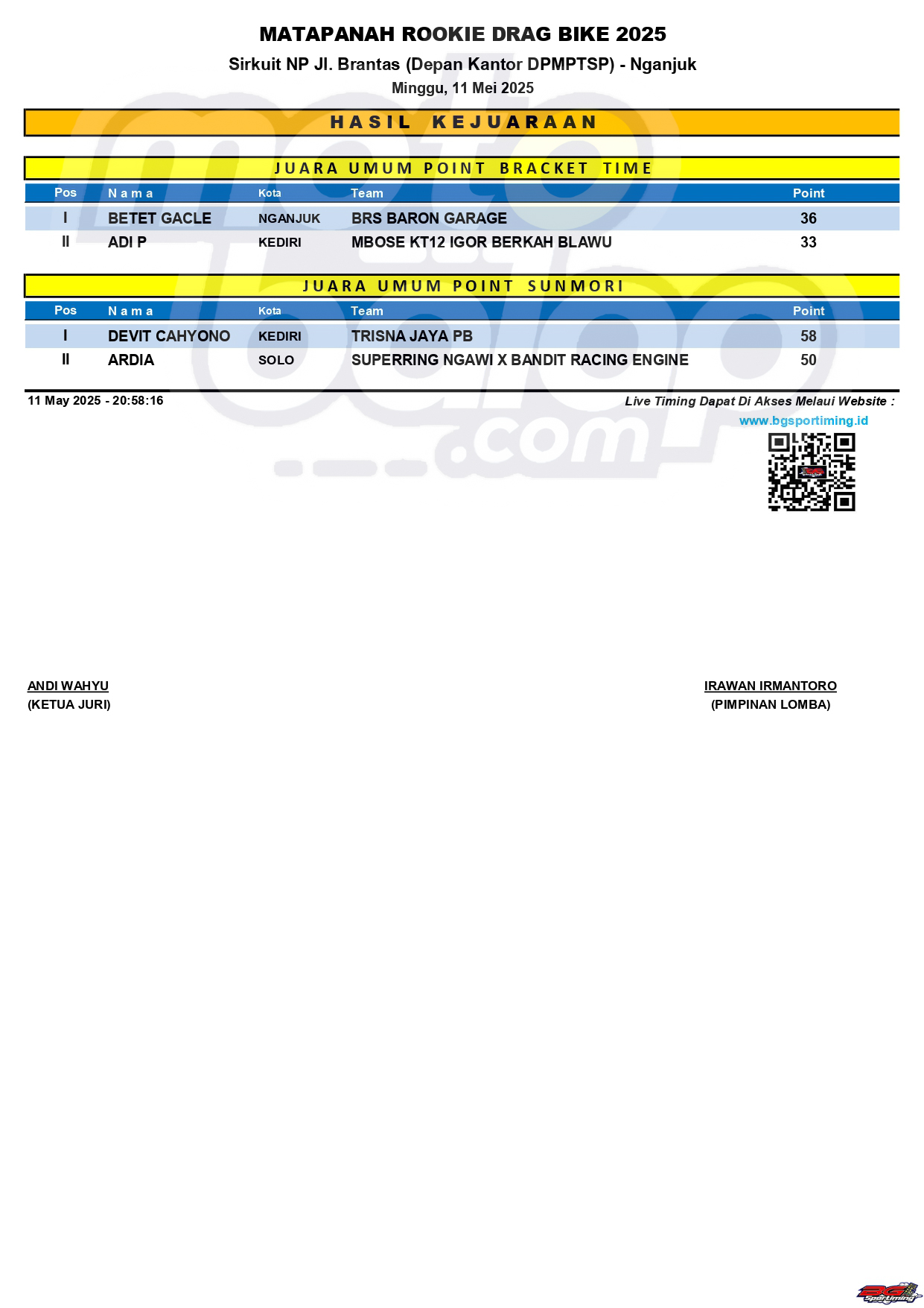 Hasil Kejuaraan Matapanah Rookie Drag Bike Nganjuk 11 Mei 2025