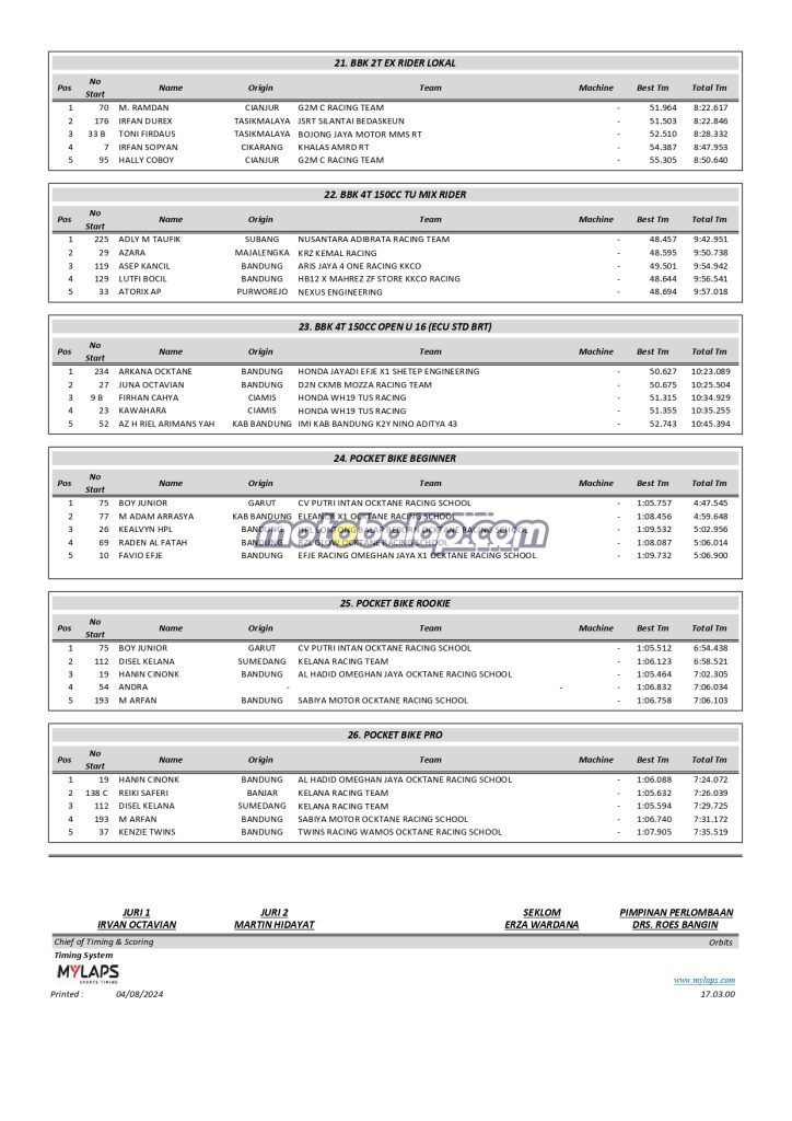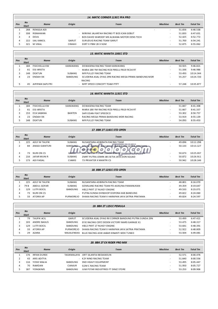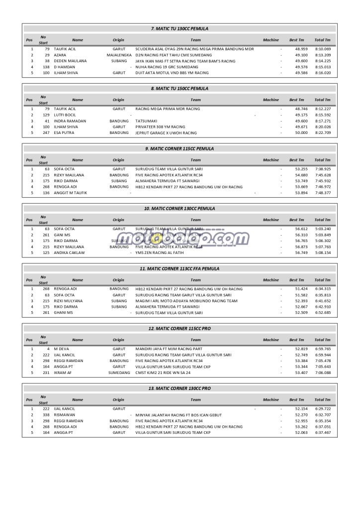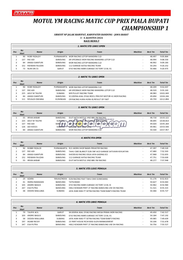 MOTOBALAP.COM- Berikut ini adalah Hasil Motul YM Racing Matic Cup Prix Piala Bupati Championship Put. 1, Yang Terselenggara di Sirkuit NP. Stadion Jalak Harupat Kabupaten Bandung Jawa Barat (4/8).