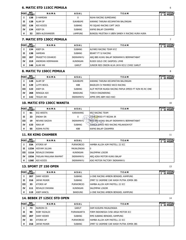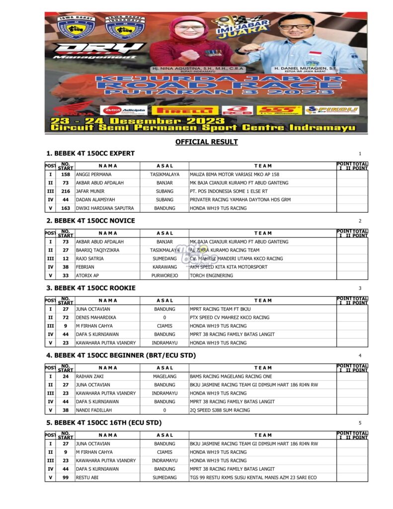 Dari keselurahan kelas yang dilombakan, Kejurda Jabar Road Race 2023 Indramayu adalah sebagai berikut: