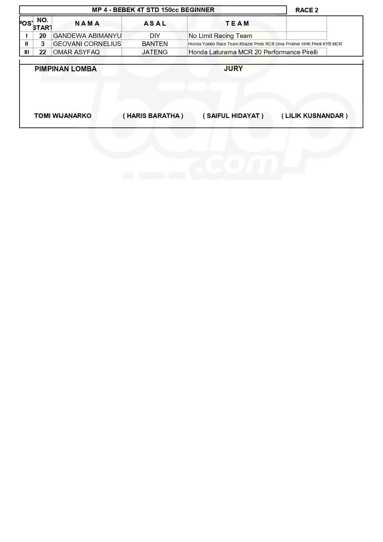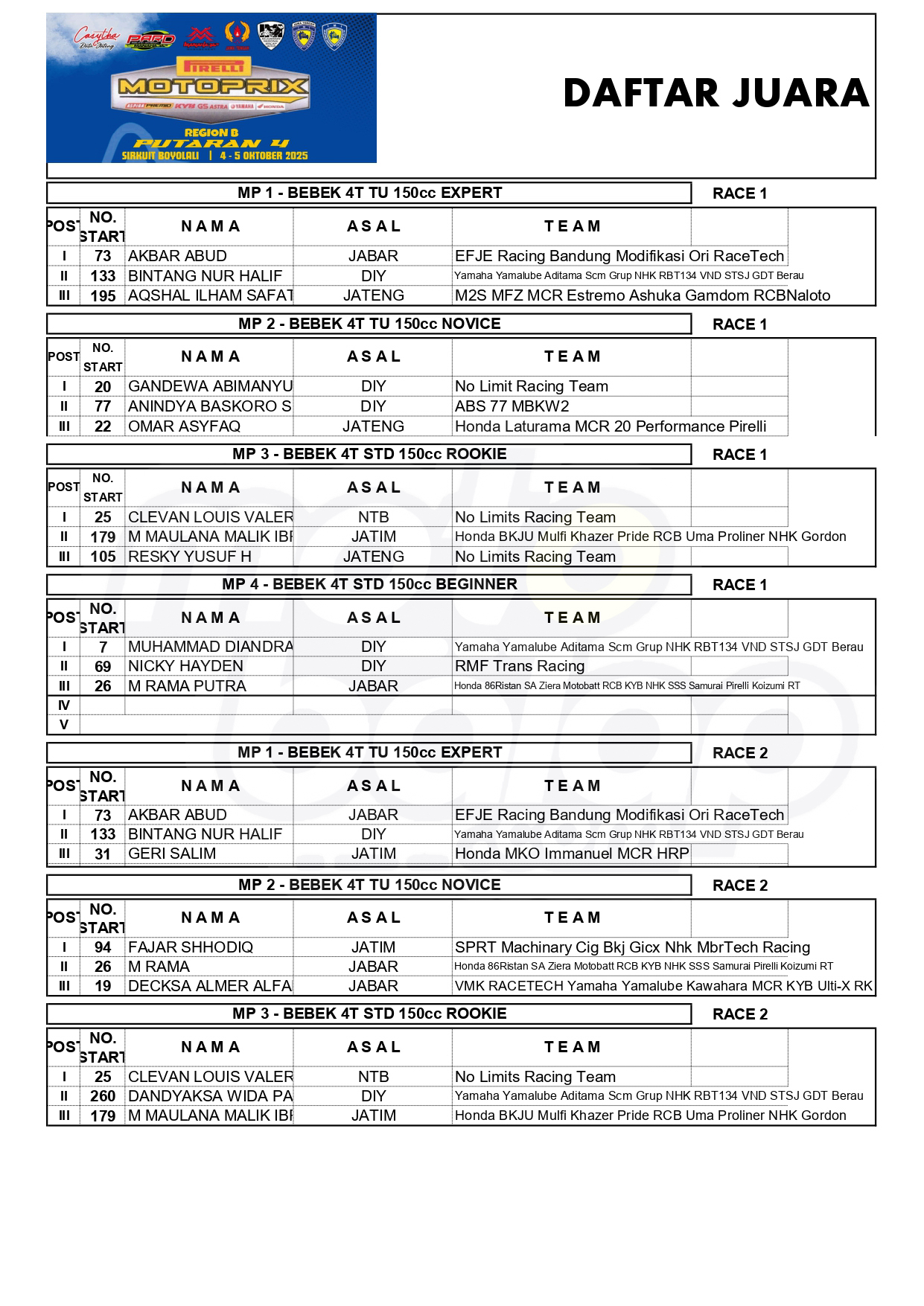 MOTOBALAP.COM – Berikut adalah Hasil Kejurnas Motoprix Region B Seri 4, yang terselenggara Sabtu-Minggu (4-5/10) di Sirkuit Permanen Boyolali, Jawa Tengah.