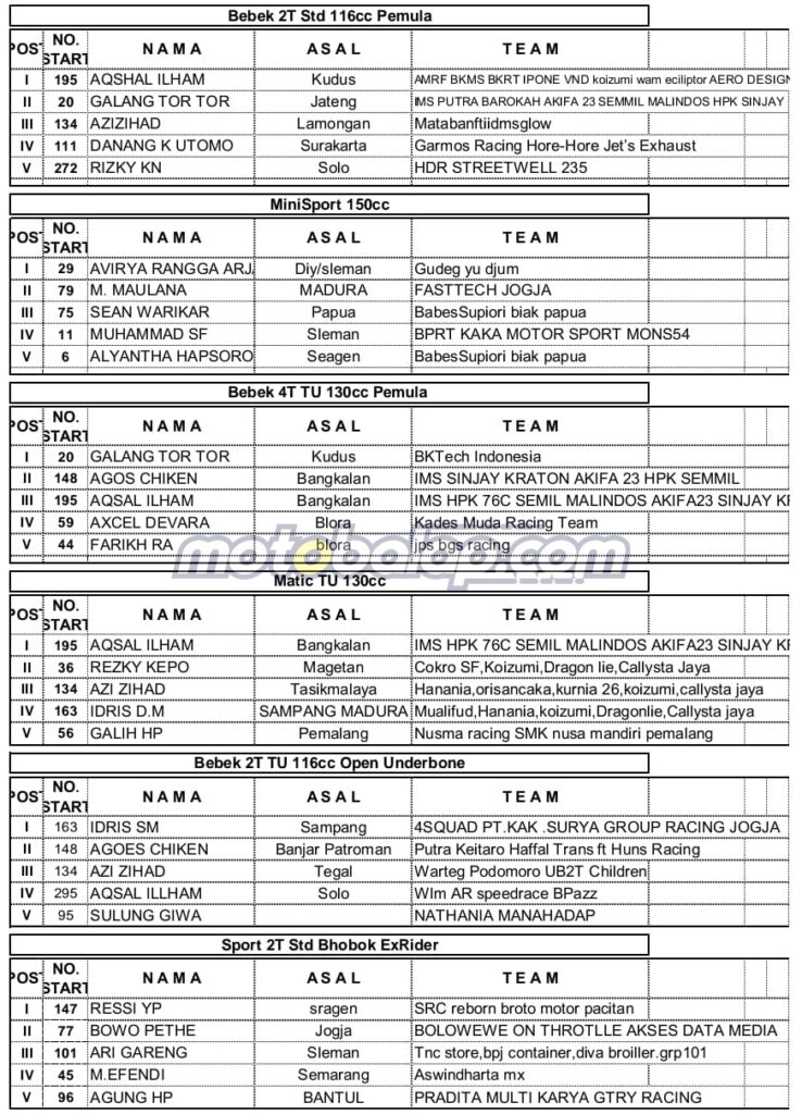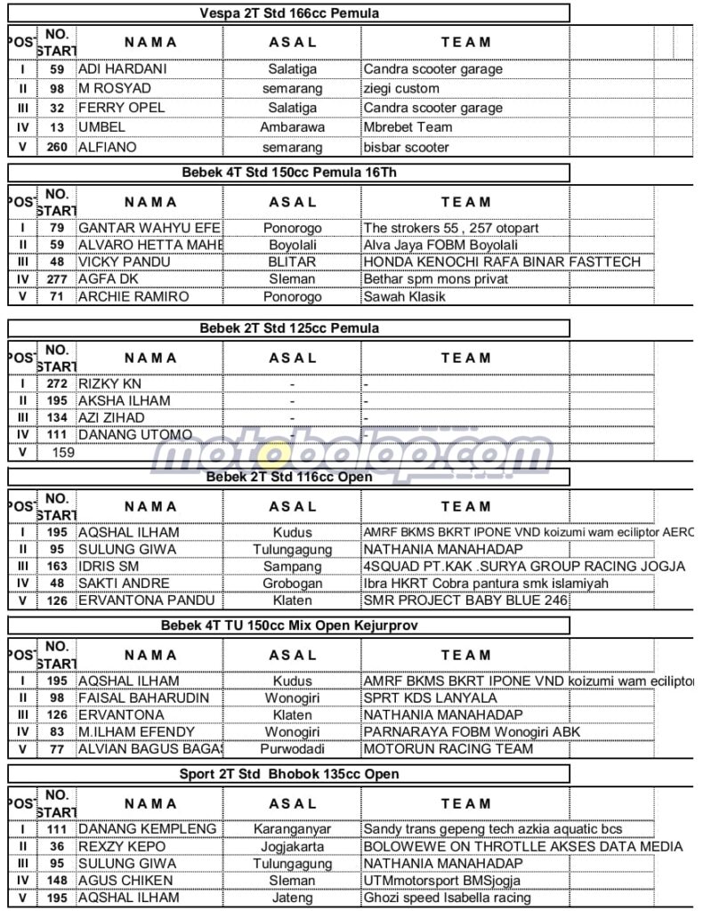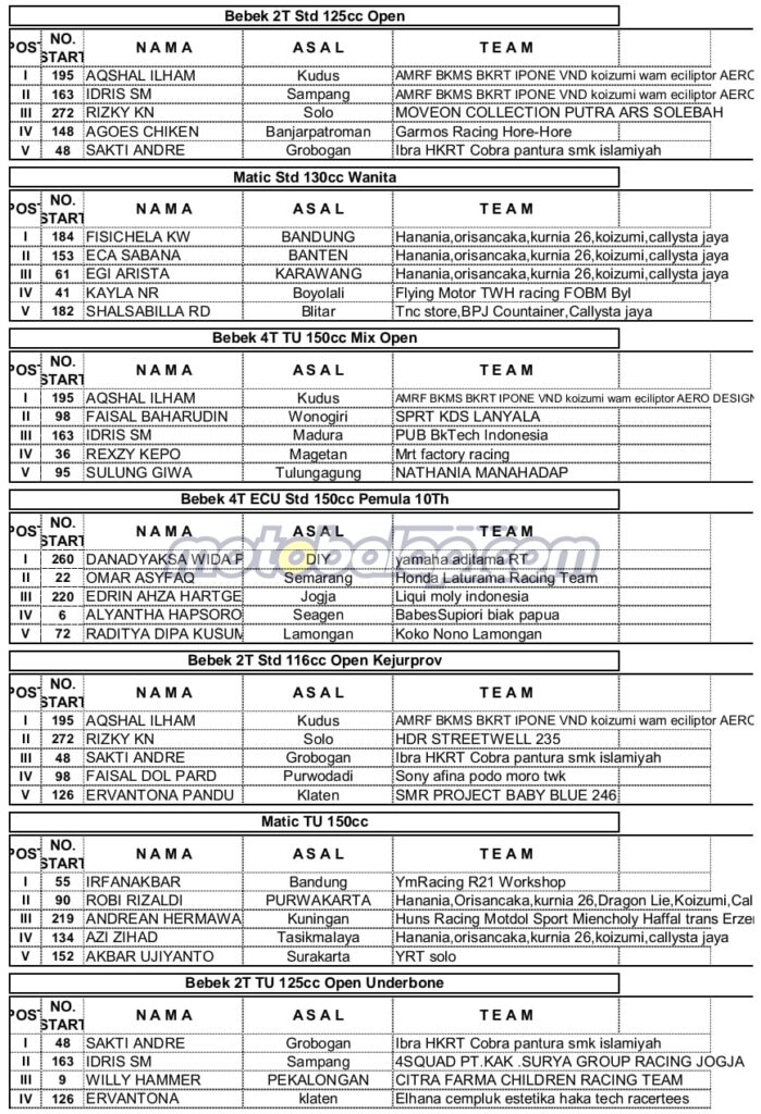 Di bawah ini, merupakan Hasil Kejurprov Jateng Casytha Manahadap Road Race seri 2 Boyolali adalah sebagai berikut: