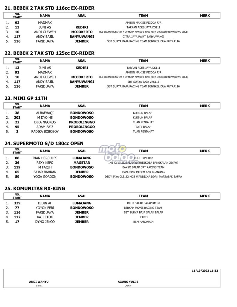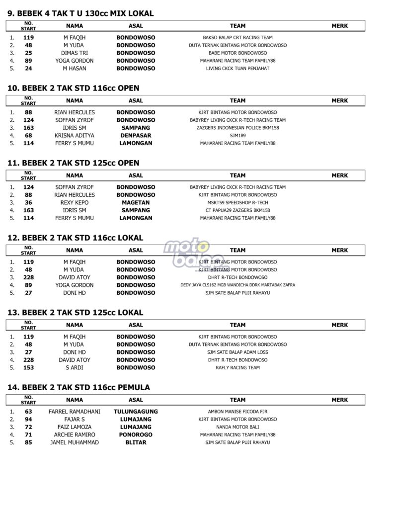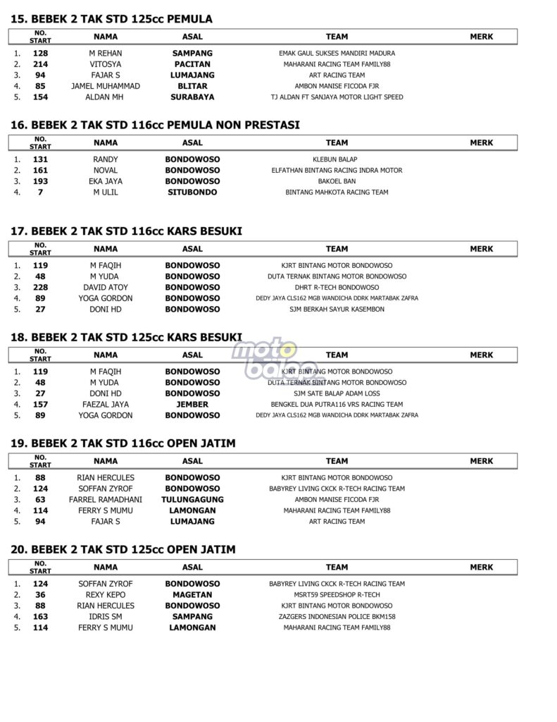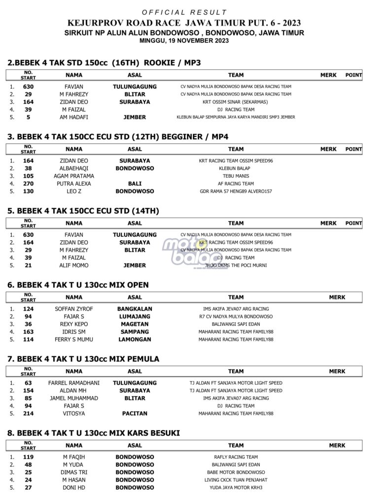 Dari keselurahan kelas yang dilombakan, di bawah ini Hasil Kejurprov Road Race Jawa Timur Putaran 6 Bondowoso adalah sebagai berikut: