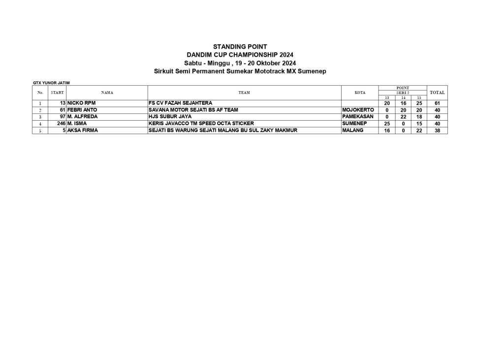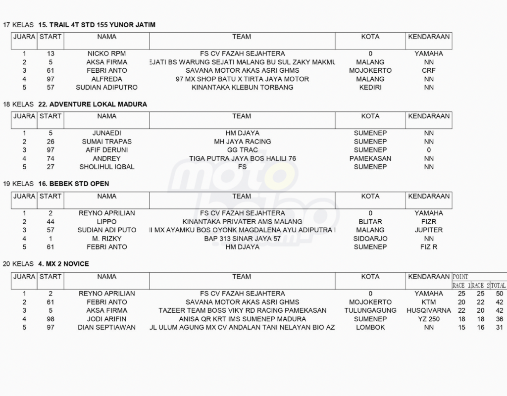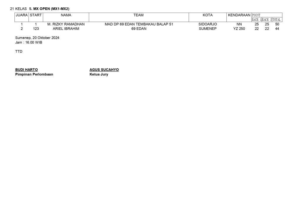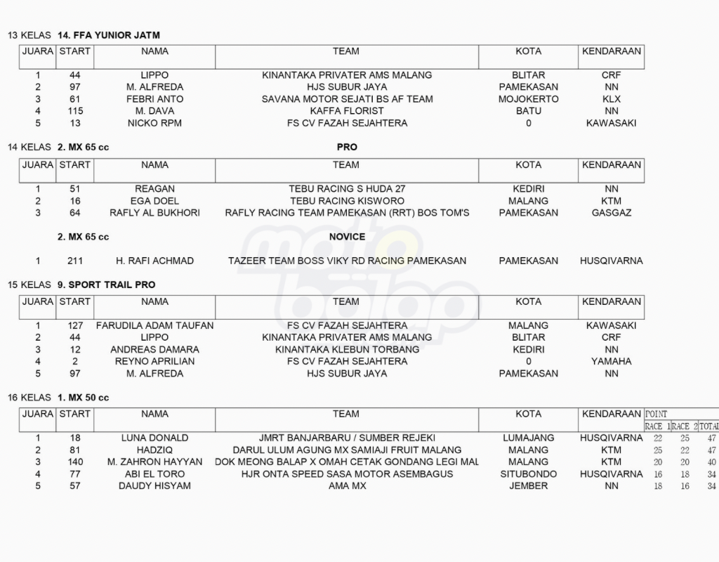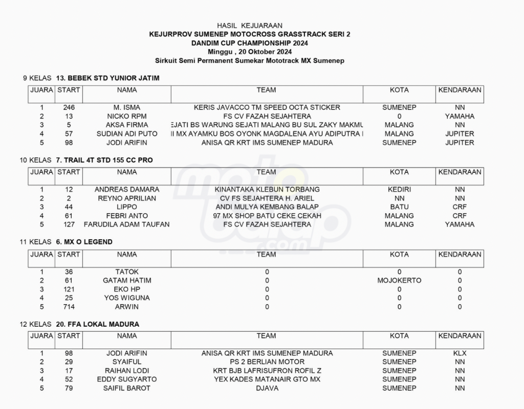 Dari keseluruhan kelas yang dilombakan, di bawah ini merupakan Hasil Kejurprov Sumenep Motocross Grasstrack Seri 2 Dandim Cup Championship 2024 adalah sebagai berikut: