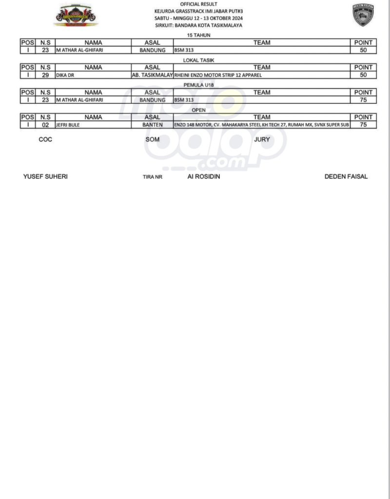 Dari keseluruhan kelas yang dilombakan, di bawah ini merupakan hasil keseluruhan kejurda Grasstrack IMI Jabar Putaran 3 adalah sebagai berikut: