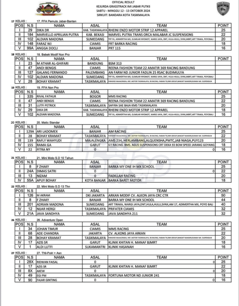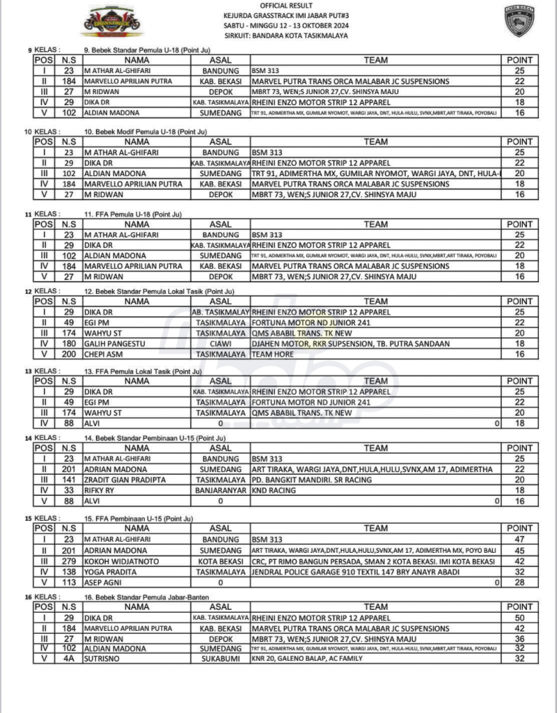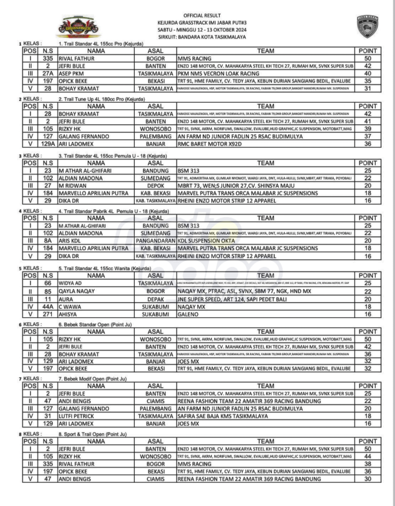 Dari keseluruhan kelas yang dilombakan, di bawah ini merupakan hasil keseluruhan kejurda Grasstrack IMI Jabar Putaran 3 adalah sebagai berikut: