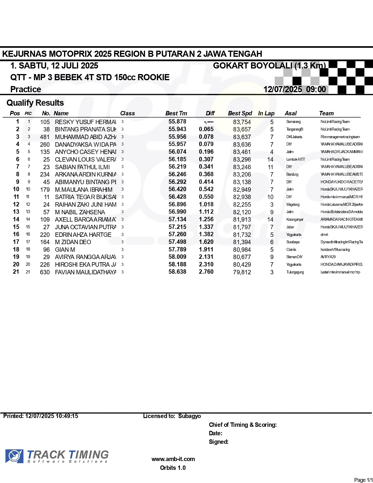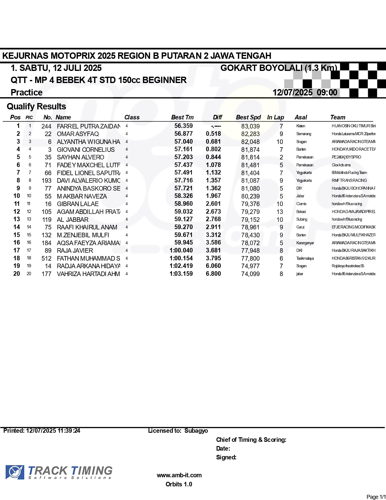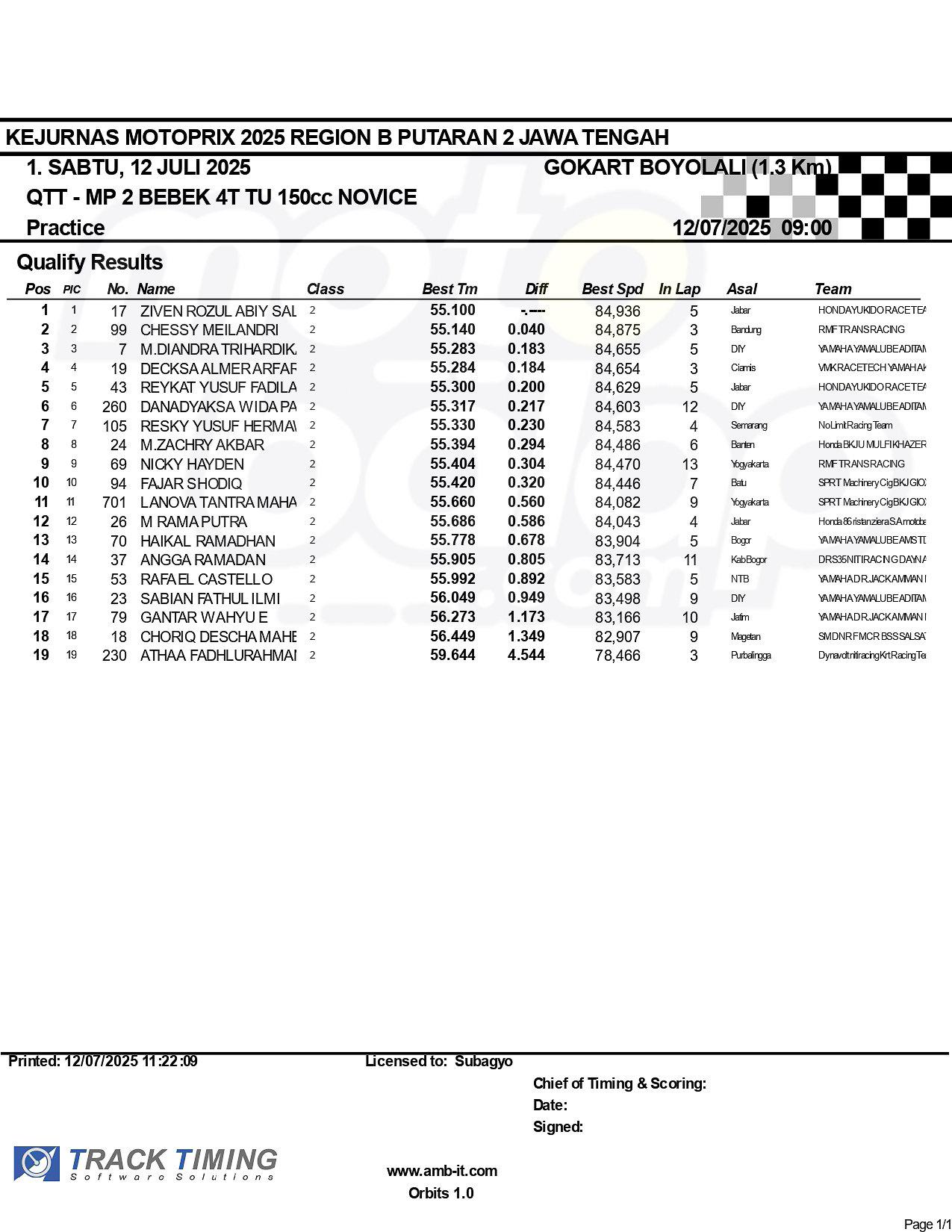 MOTOBALAP.COM – Berikut adalah hasil Kualifikasi Kejurnas Motoprix (Kelas Poin) Region B Seri 2 yang berlangsung di Sirkuit Semut Aspal / Go Mart Boyolali, Jawa Tengah Sabtu 12 Juli 2025.