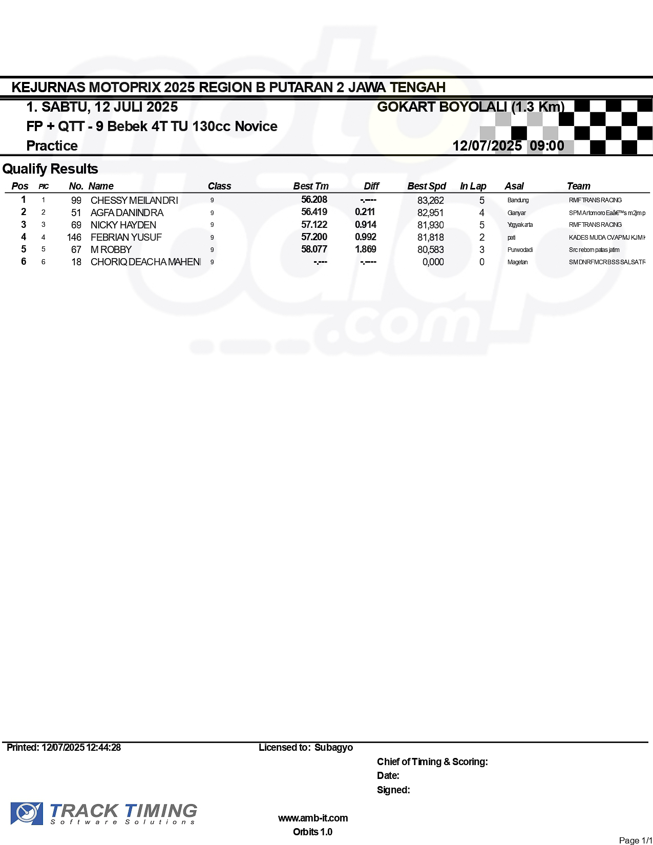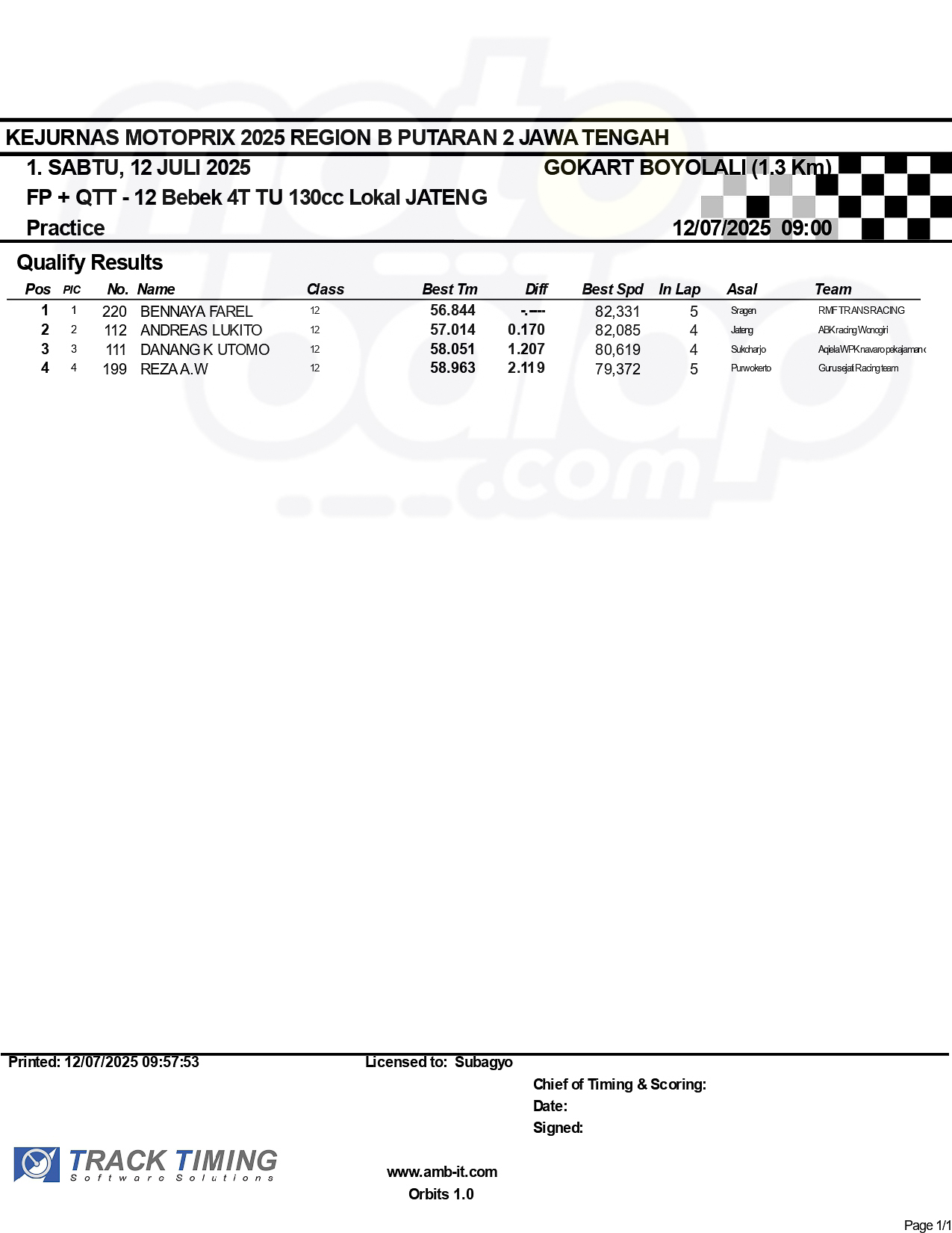 MOTOBALAP.COM – Berikut adalah hasil Kualifikasi Kejurnas Motoprix (Kelas Supporting) Region B Seri 2 yang berlangsung di Sirkuit Semut Aspal / Go Kart Boyolali, Jawa Tengah Sabtu 12 Juli 2025.