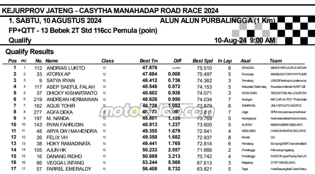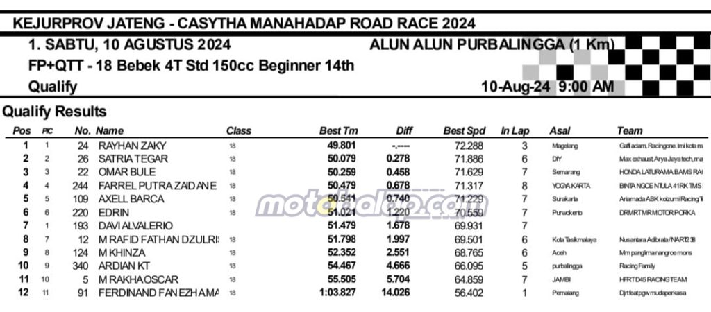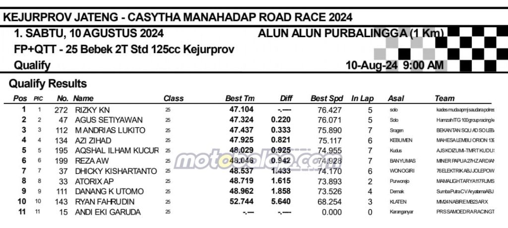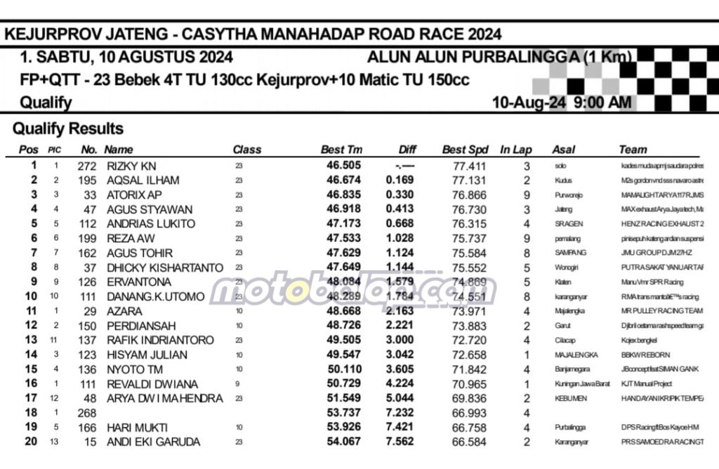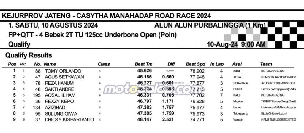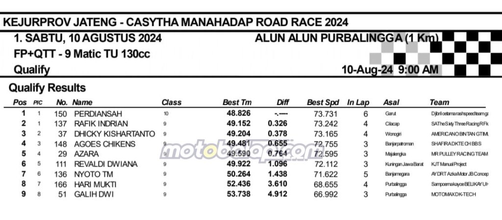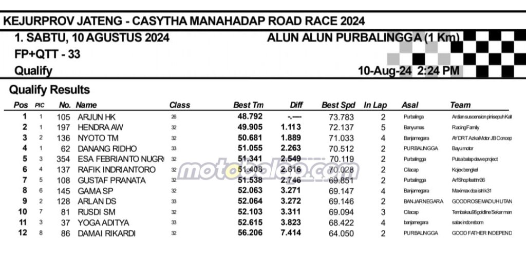 MOTOBALAP.COM- Berikut adalah hasil sesi kualifikasi Kejurprov Jateng Casytha Manahadap Road Race Championship 2024 putaran kedua yang berlangsung di sirkuit NP. Alun-alun Purbalingga, Jawa Tengah pada 10 Agustus 2024.