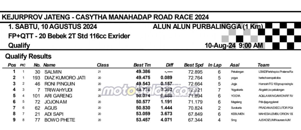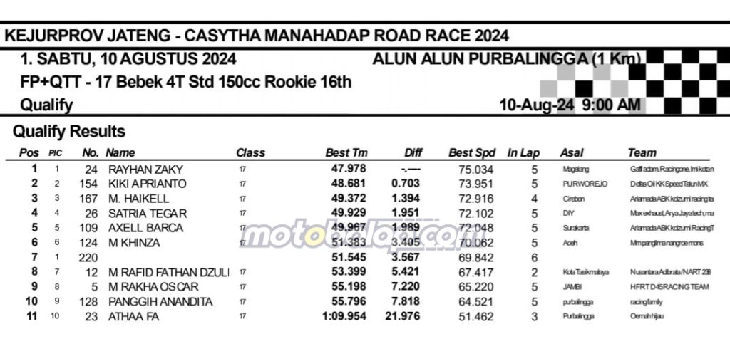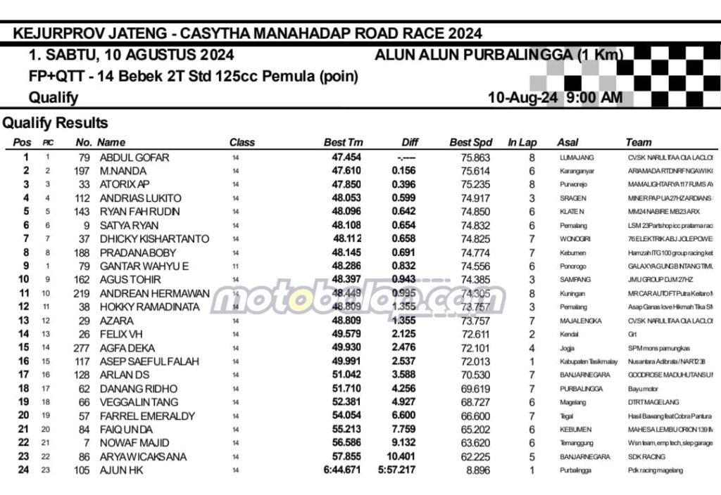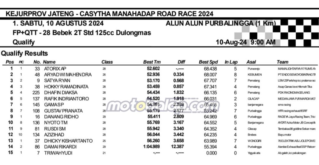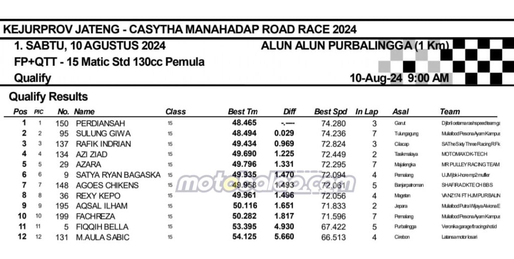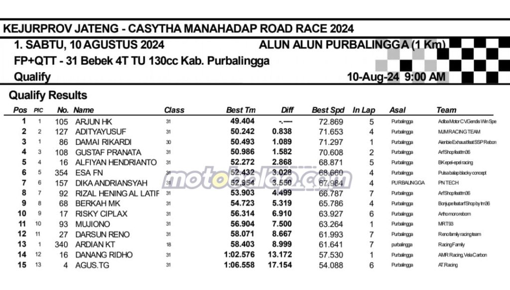 MOTOBALAP.COM- Berikut adalah hasil sesi kualifikasi Kejurprov Jateng Casytha Manahadap Road Race Championship 2024 putaran kedua yang berlangsung di sirkuit NP. Alun-alun Purbalingga, Jawa Tengah pada 10 Agustus 2024.