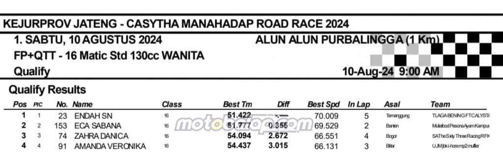 Hasil Kualifikasi (QTT) Kejurprov Jateng Casytha Manahadap Road Race Seri 2 Purbalingga 2024