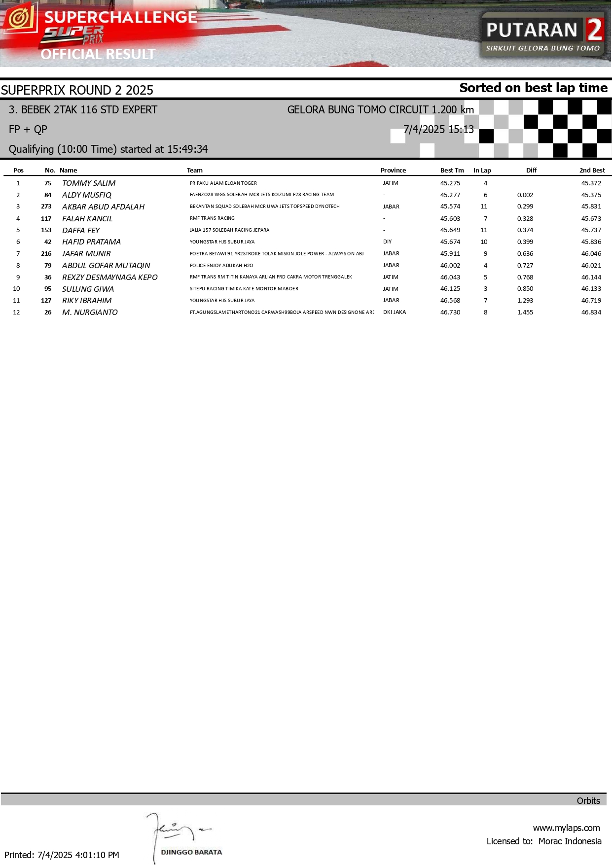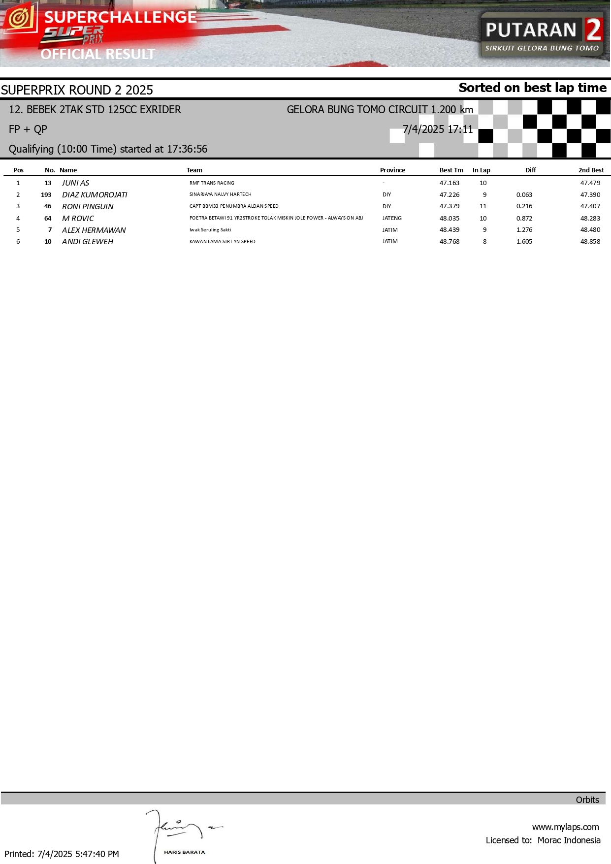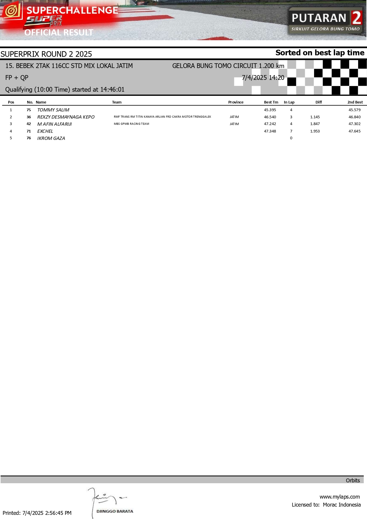 MOTOBALAP.COM – Berikut adalah hasil sesi kualifikasi kejuaraan Superchallenge Super Prix Seri 2 yang berlangsung di sirkuit Gelora Bung Tomo (GBT) Surabaya pada 4 Juli 2025.