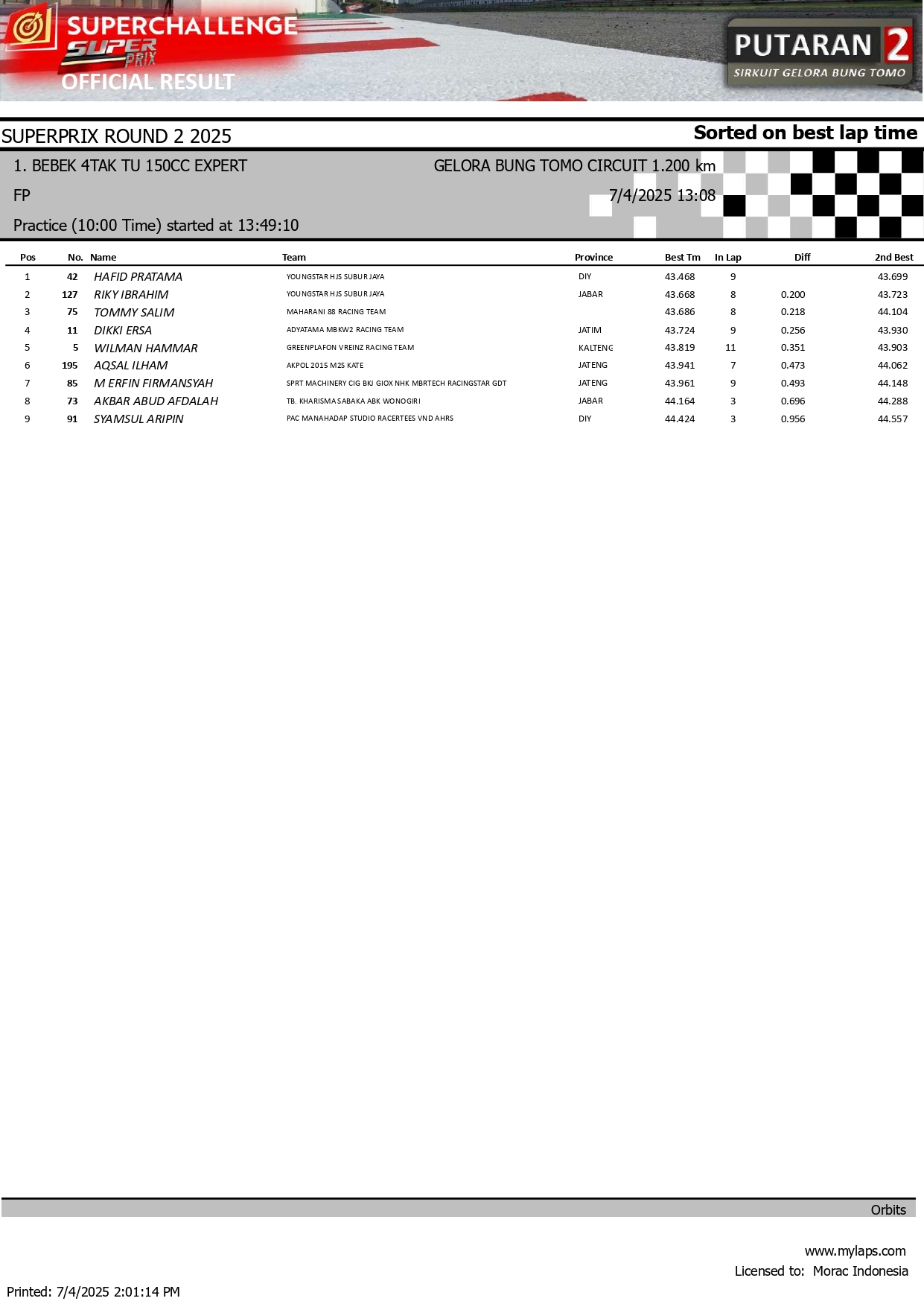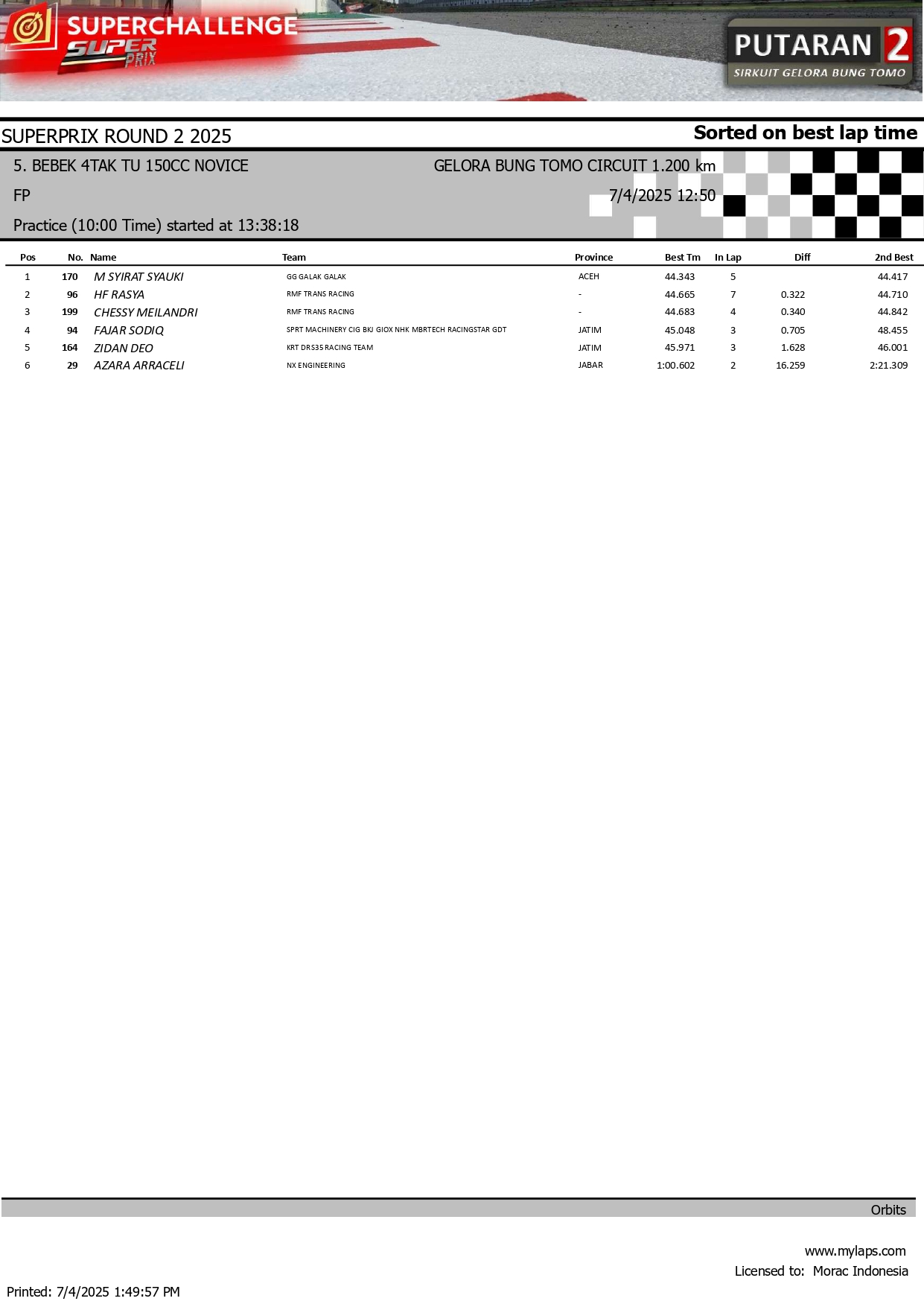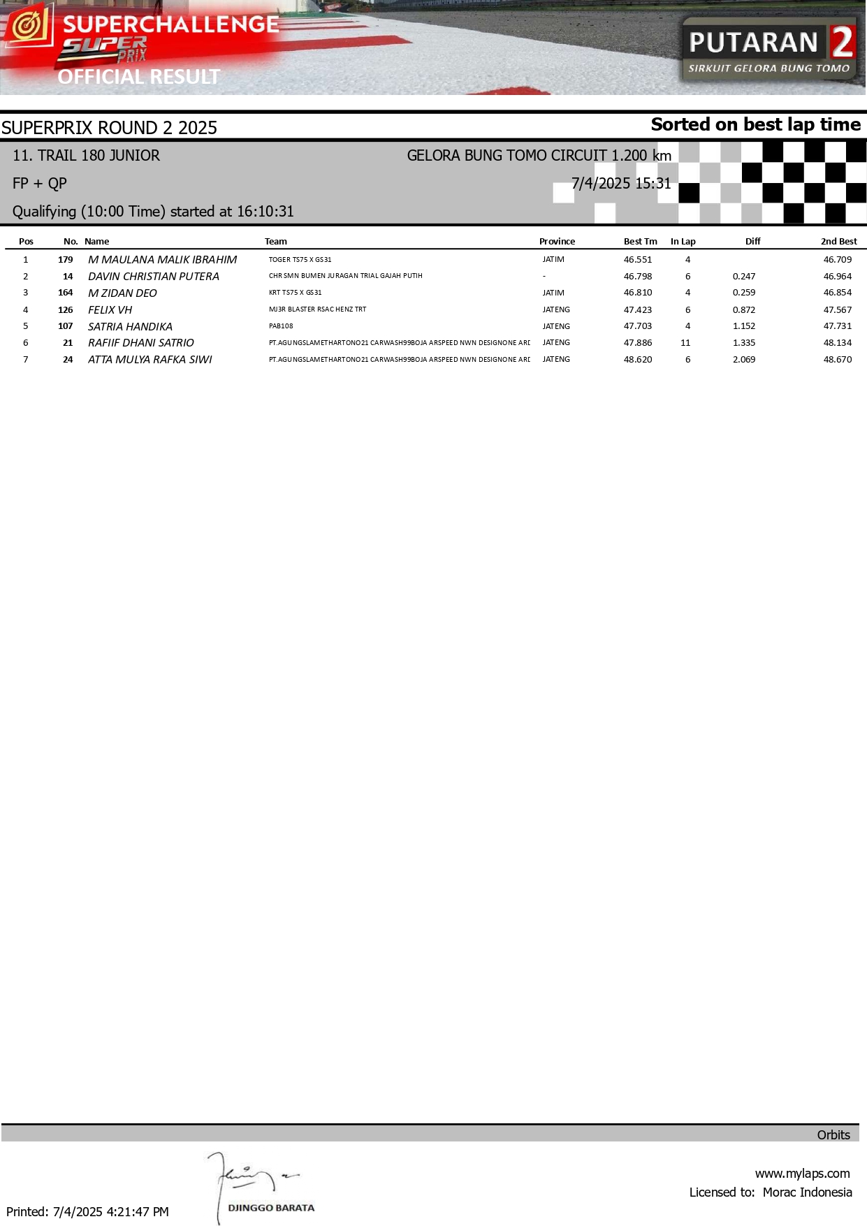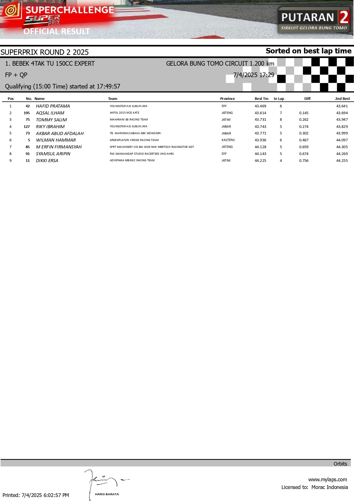 MOTOBALAP.COM – Berikut adalah hasil sesi kualifikasi kejuaraan Superchallenge Super Prix Seri 2 yang berlangsung di sirkuit Gelora Bung Tomo (GBT) Surabaya pada 4 Juli 2025.