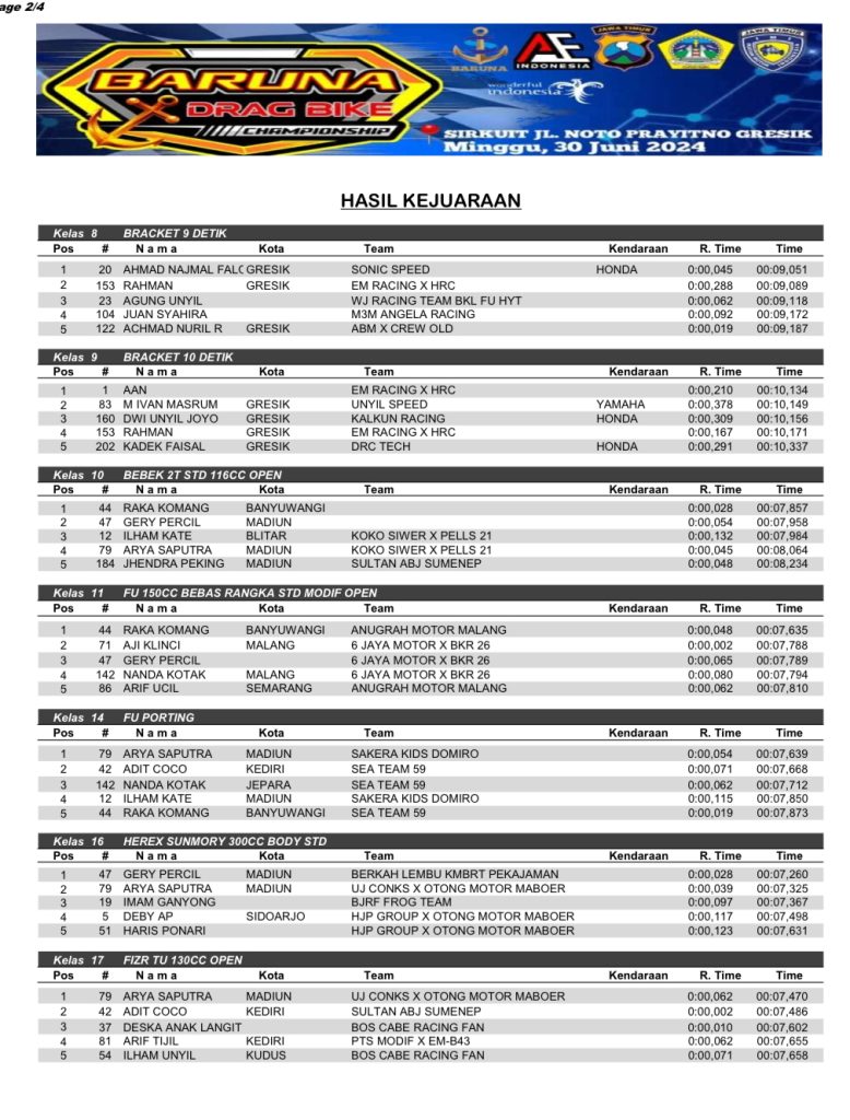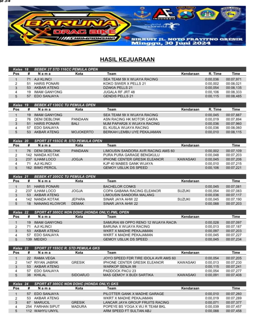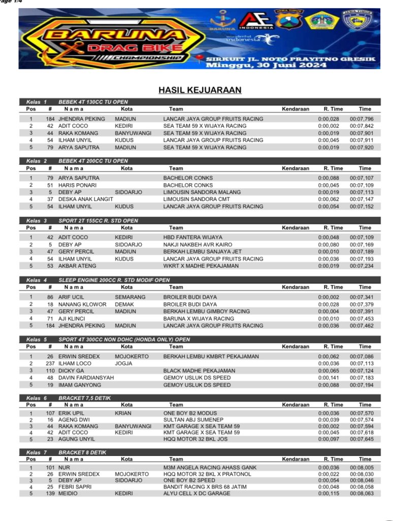 Dari semua kelas serta kategori yang dilombakan, berikut ini merupakan hasil lengkap Baruna Drag Bike Championship 2024 Gresik adalah sebagai berikut: