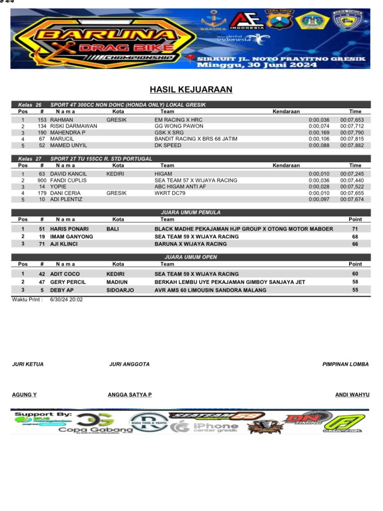 Hasil Lengkap Baruna Drag Bike Championship Gresik 2024