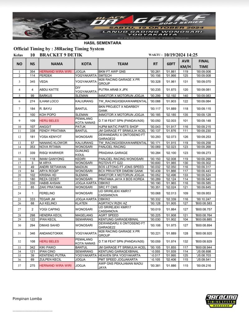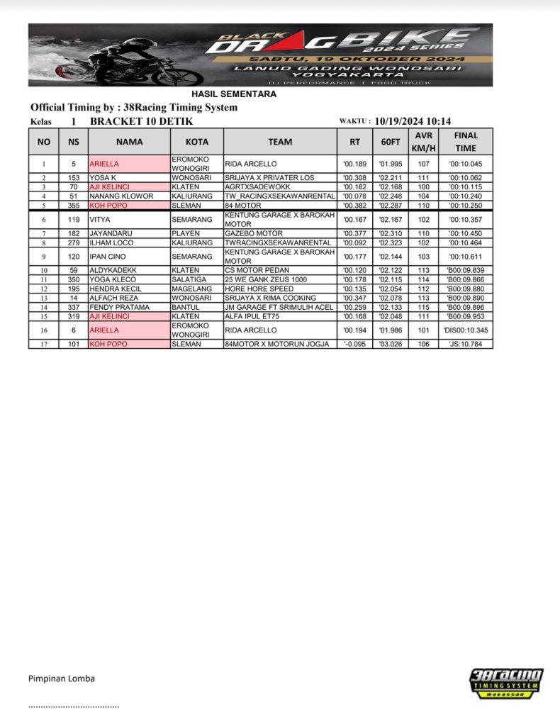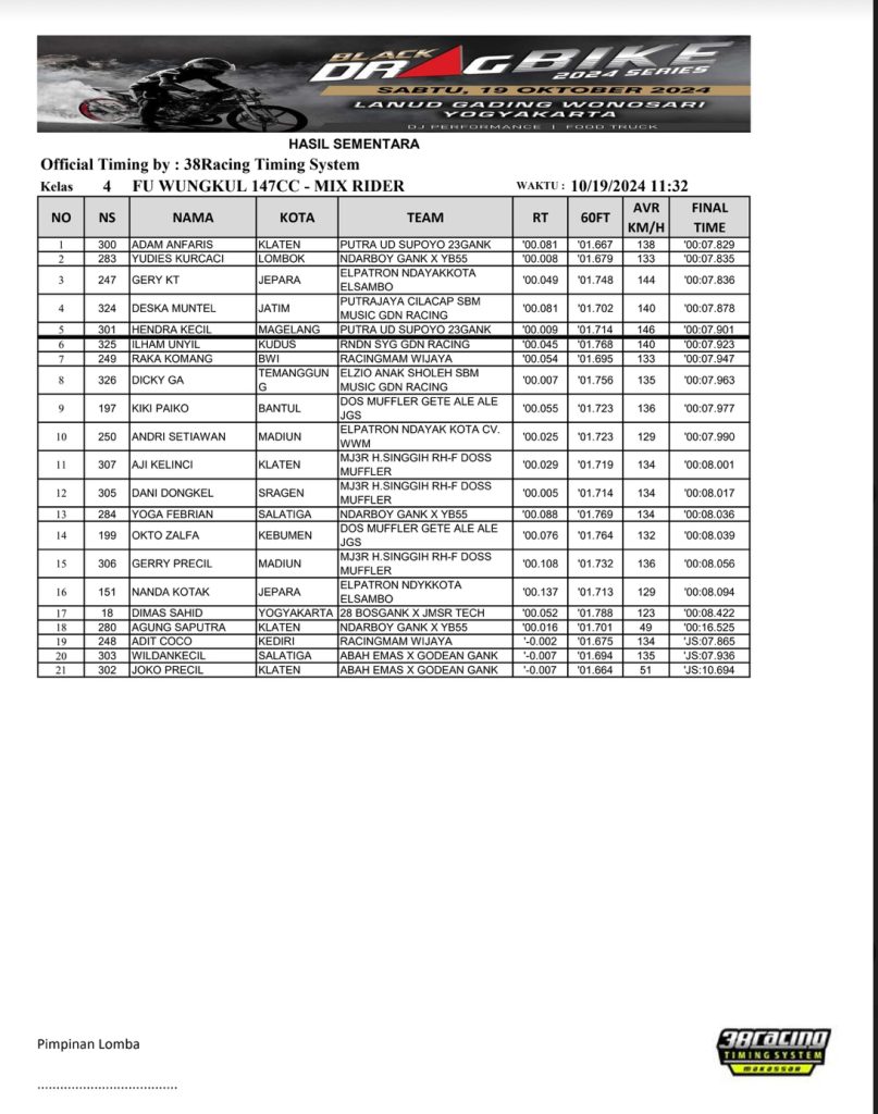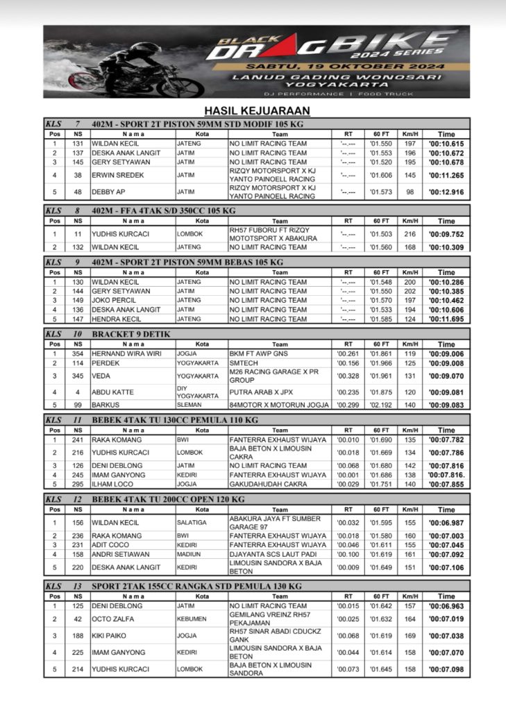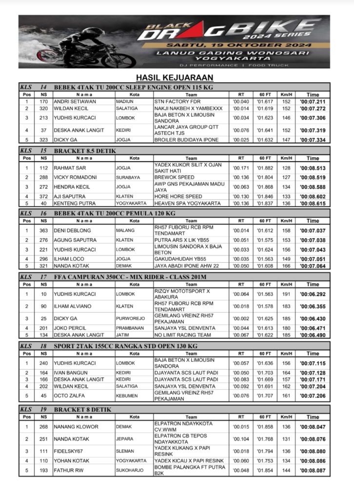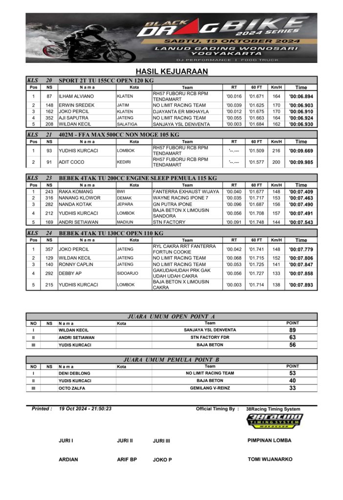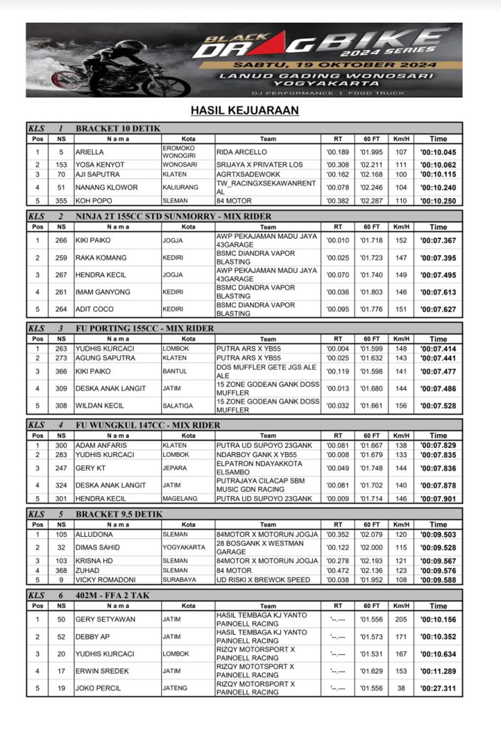 Dari keseluruhan kelas yang dilombakan, di bawah ini merupakan Hasil Lengkap Black DragBike 2024 Series Wonosari adalah sebagai berikut: