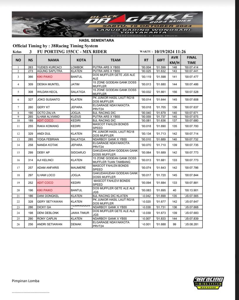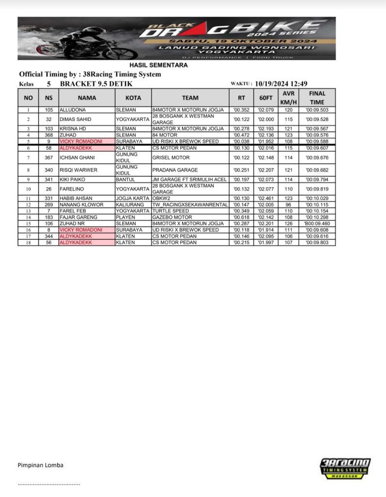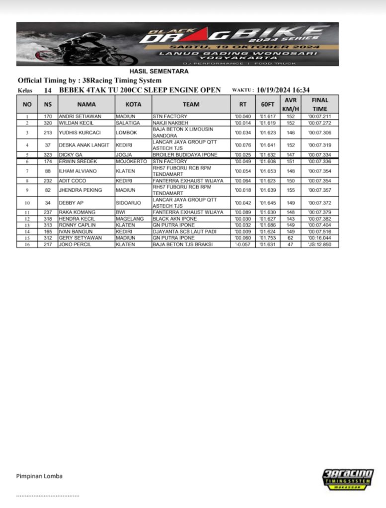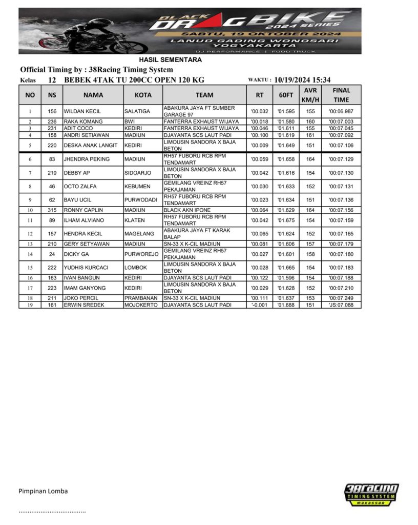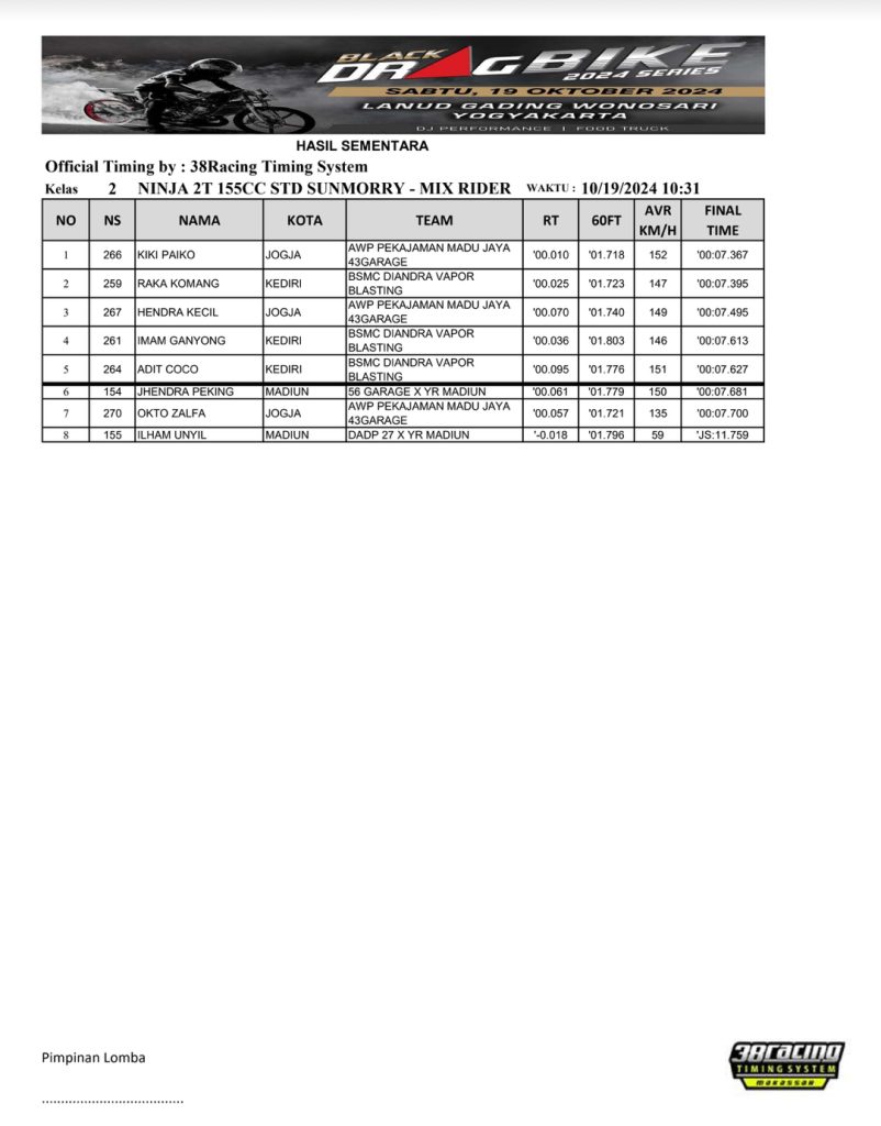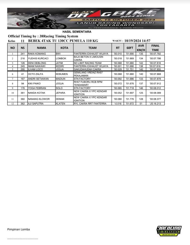 Dari keseluruhan kelas yang dilombakan, di bawah ini merupakan Hasil Lengkap Black DragBike 2024 Series Wonosari adalah sebagai berikut: