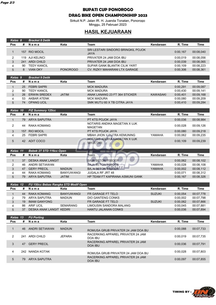 Di bawah ini merupakan Hasil Juara Bupati Cup Ponorogo Drag Bike Championship 2023 adalah sebagai berikut: