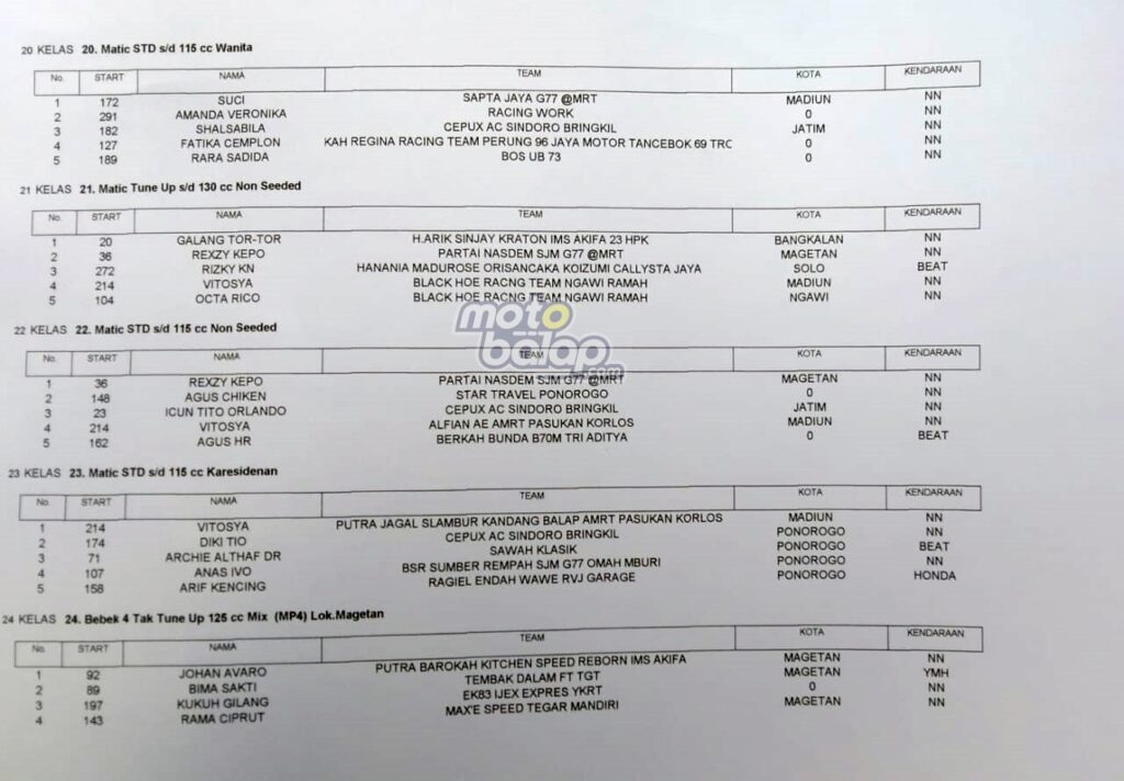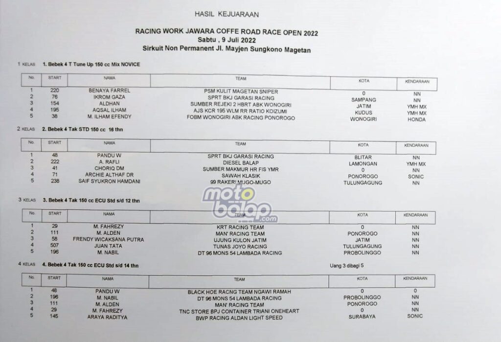 Berikut Hasil Lengkap Bupati Magetan Cup Road Race Ft Racing Work Indonesia 2022: