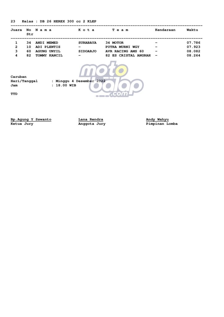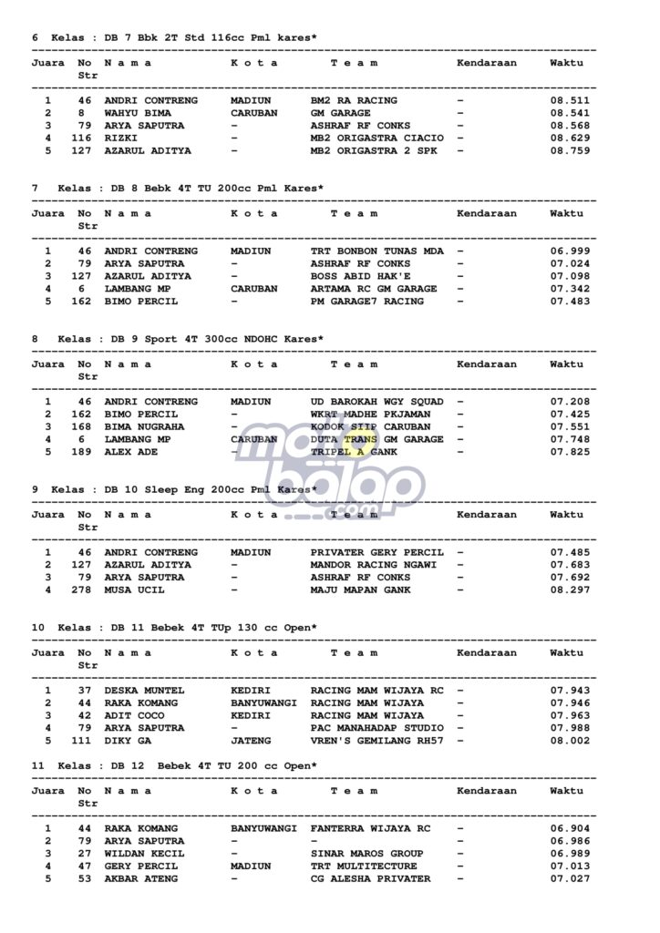 MOTOBALAP.COM – Kejuaraan Balap Motor bertajuk Gebyar Kampung Pesilat Dragbike RWK Open Championship 2022 di sirkuit non permanen Jl. MT. Haryono (depan alun-alun Caruban), Minggu (04/12/2022) berlangsung sengit.