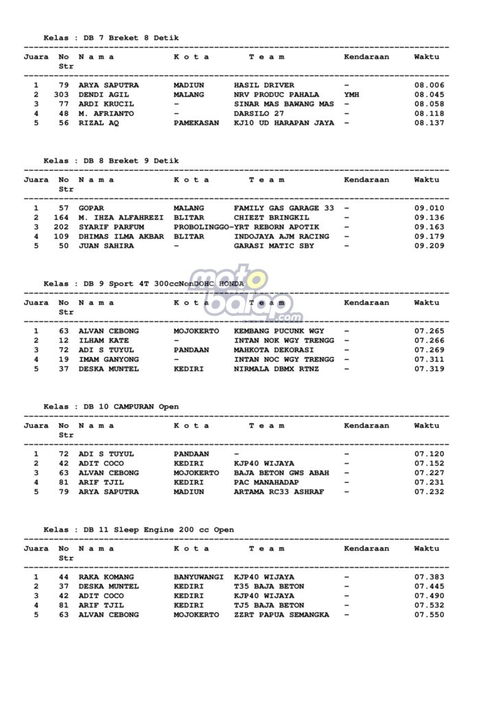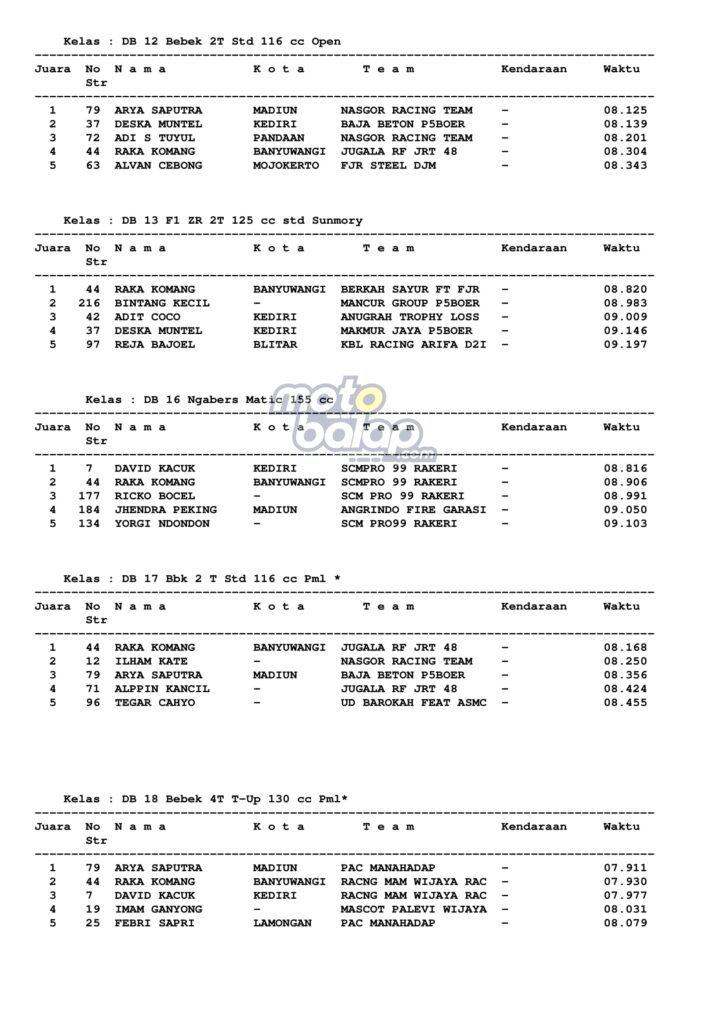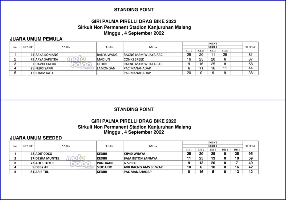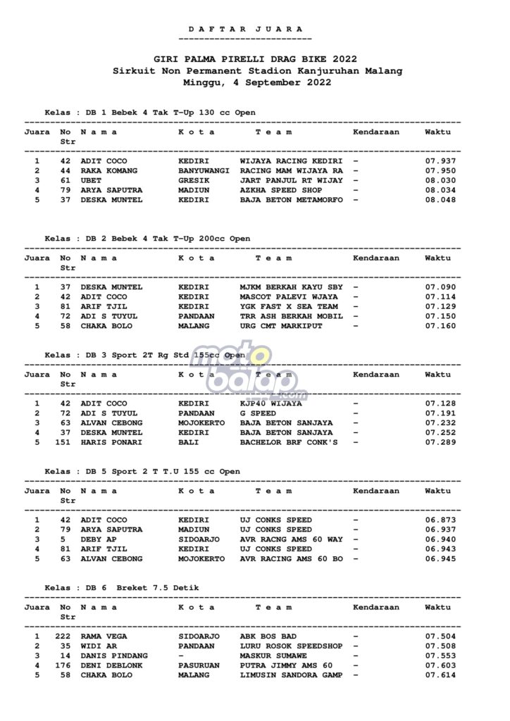 MOTOBALAP.COM Berikut merupakan hasil lengkap Giri Palma Pirelli Drag Bike Tiga Pilar 2022 yang dihelat di sirkuit non permanen Stadion Kanjuruhan Malang, Jawa Timur, Minggu (04/09/2022) adalah sebagai berikut:
