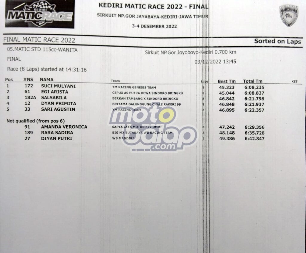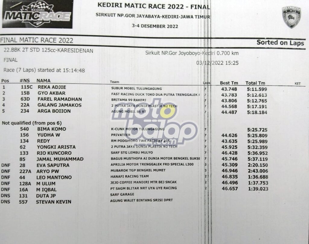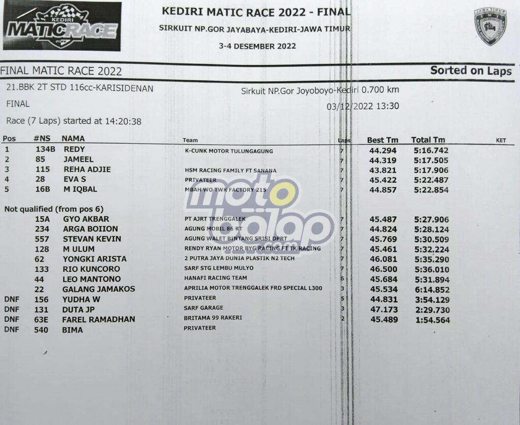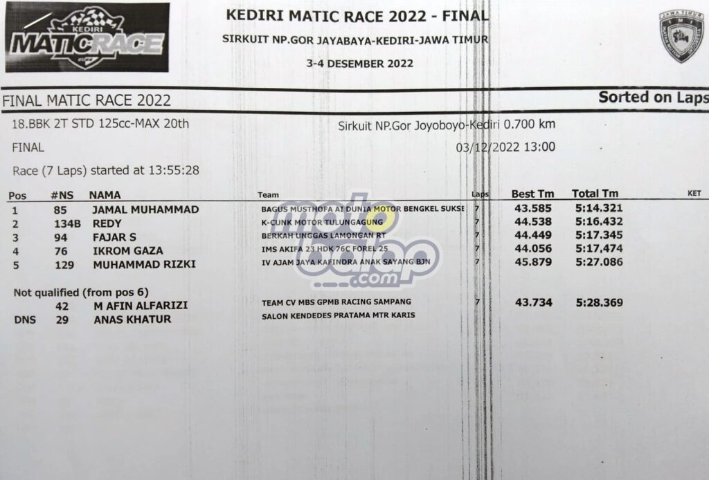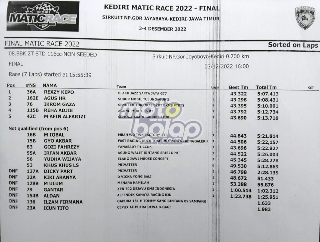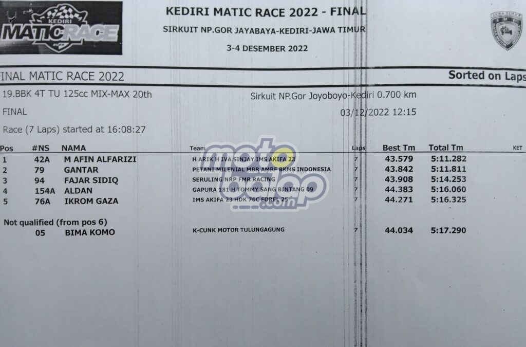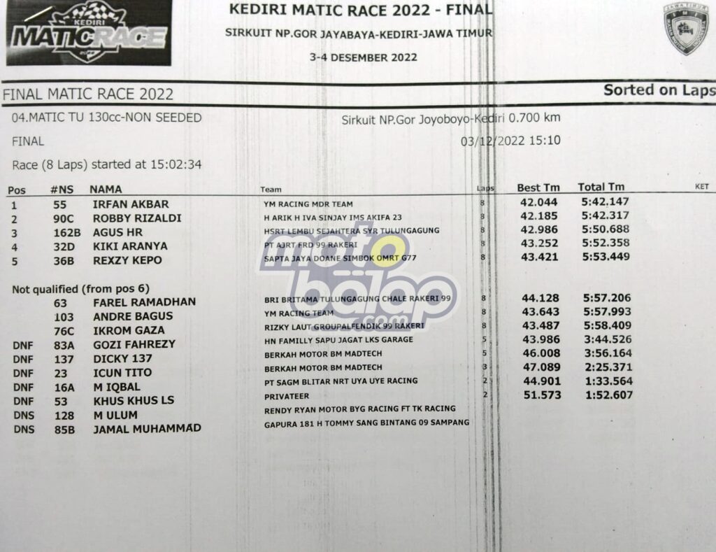 Di Bawah ini merupakan Hasil Lengkap Kediri Matic Race 2022 (Sabtu) adalah sebagai berikut: