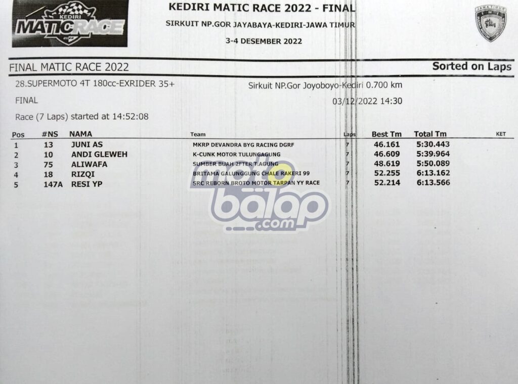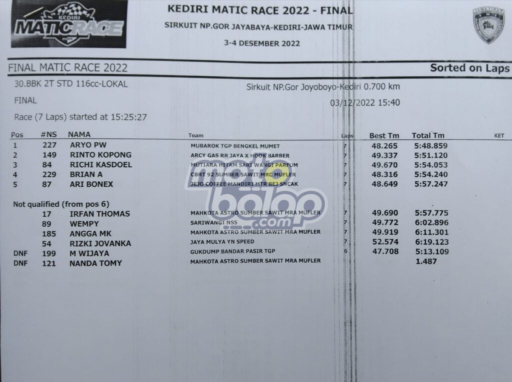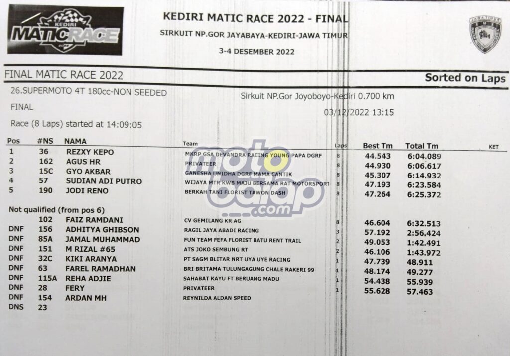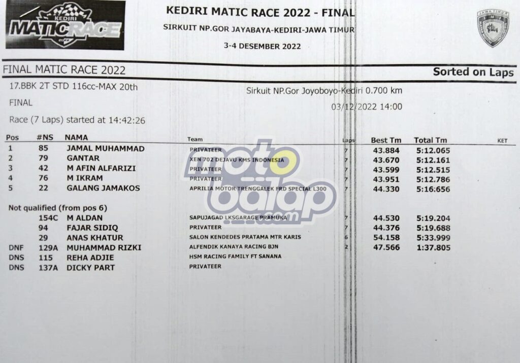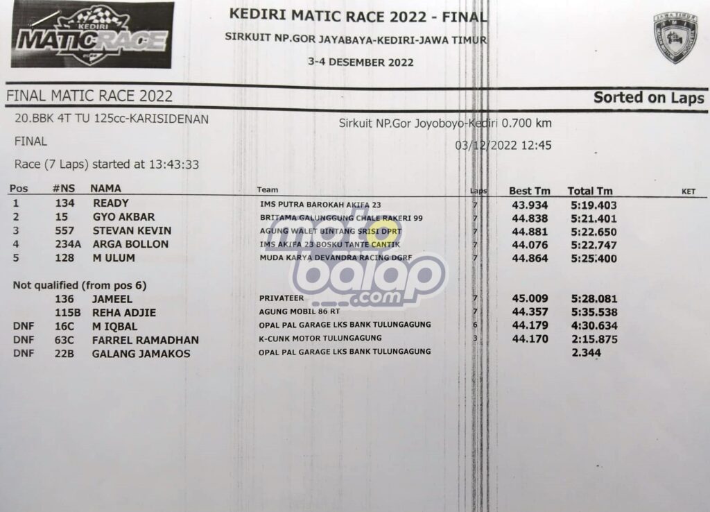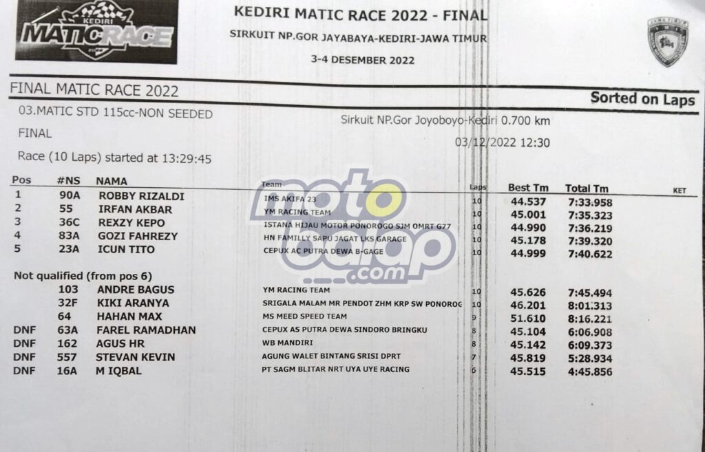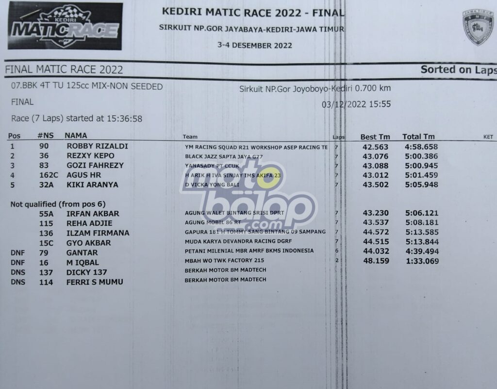Di Bawah ini merupakan Hasil Lengkap Kediri Matic Race 2022 (Sabtu) adalah sebagai berikut: