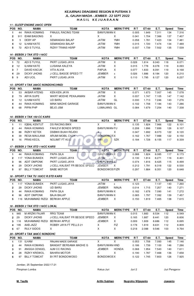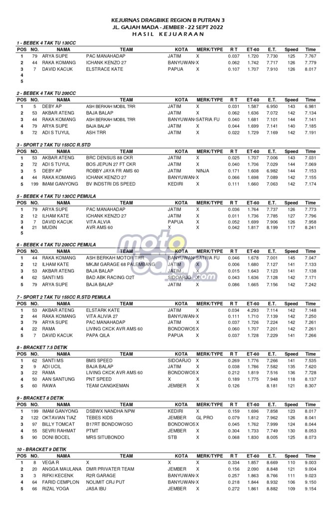 Berikut merupakan Hasil Lengkap Kejurnas Drag Bike Region B 2022 Putaran 3 Jember adalah sebagai berikut: