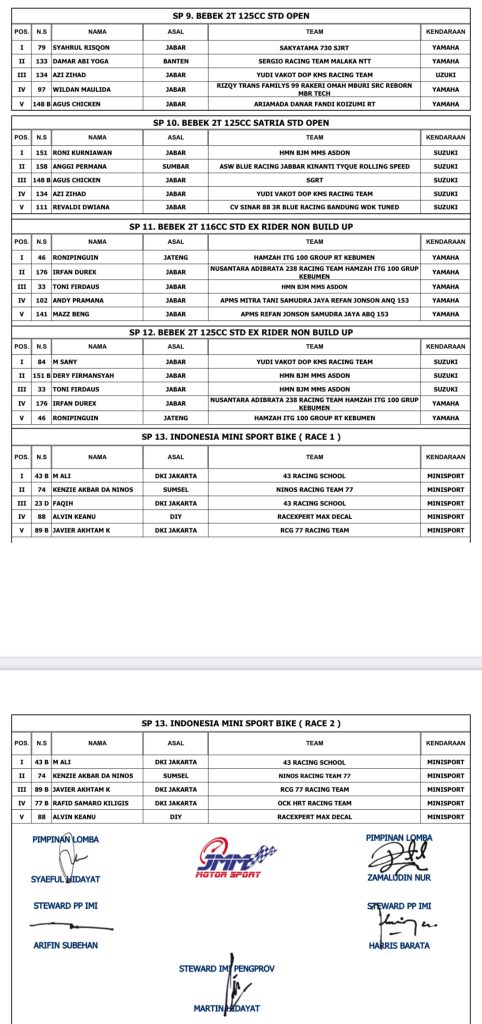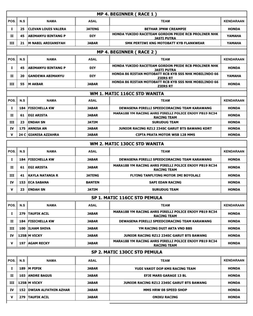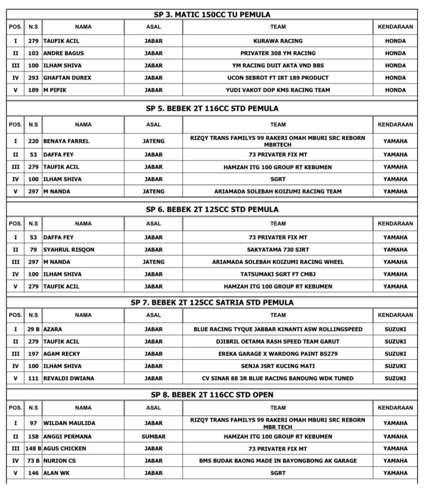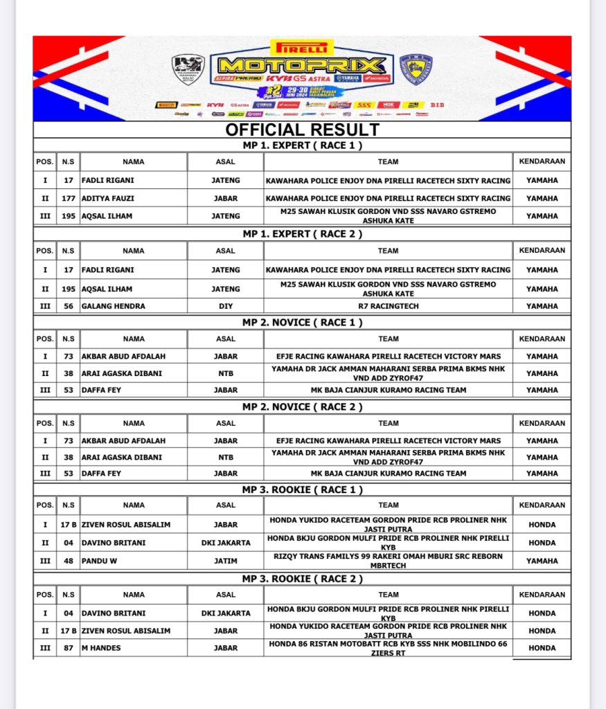 Dari semua kelas yang dilombakan, di bawah ini merupakan hasil lengkap Motoprix Region B Putaran 2 Tasikmalaya 2024 adalah sebagai berikut: