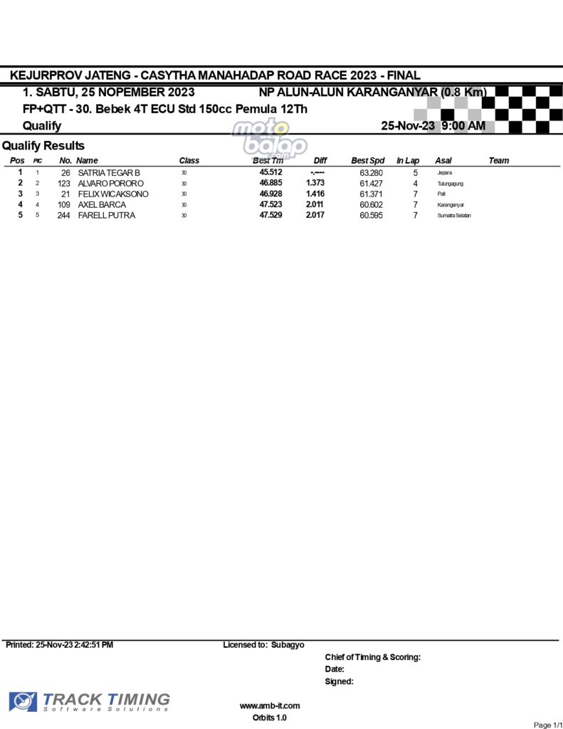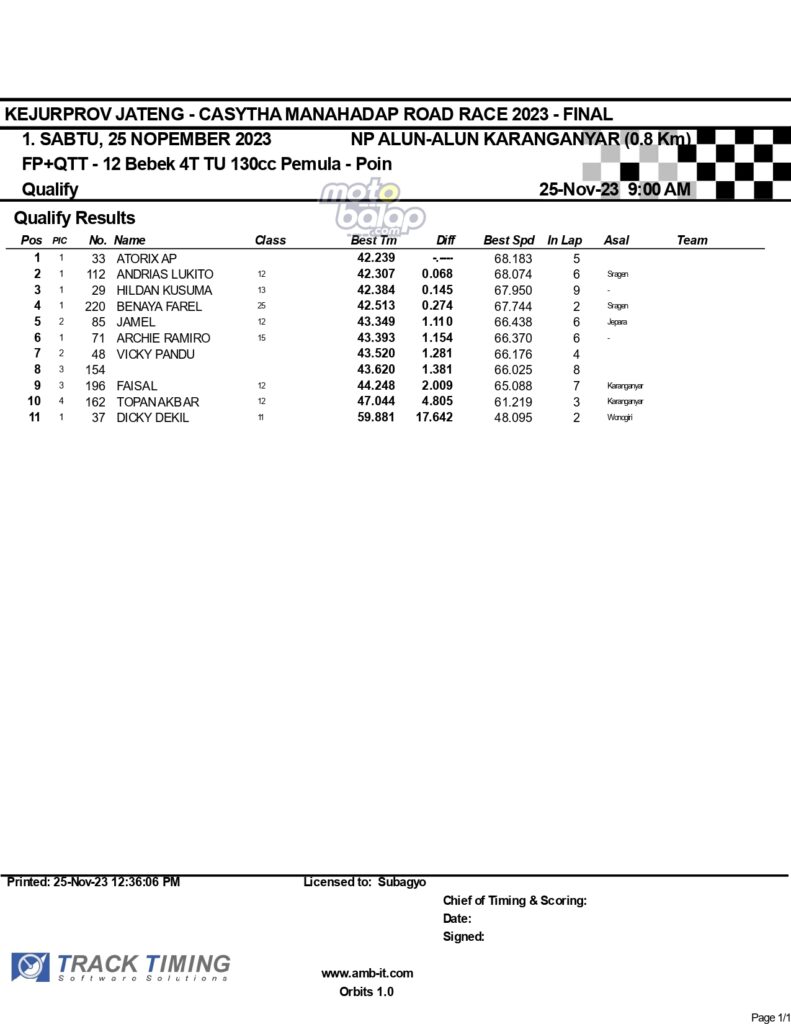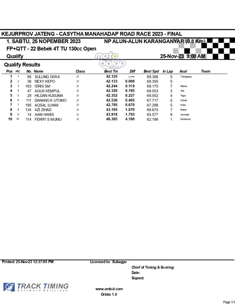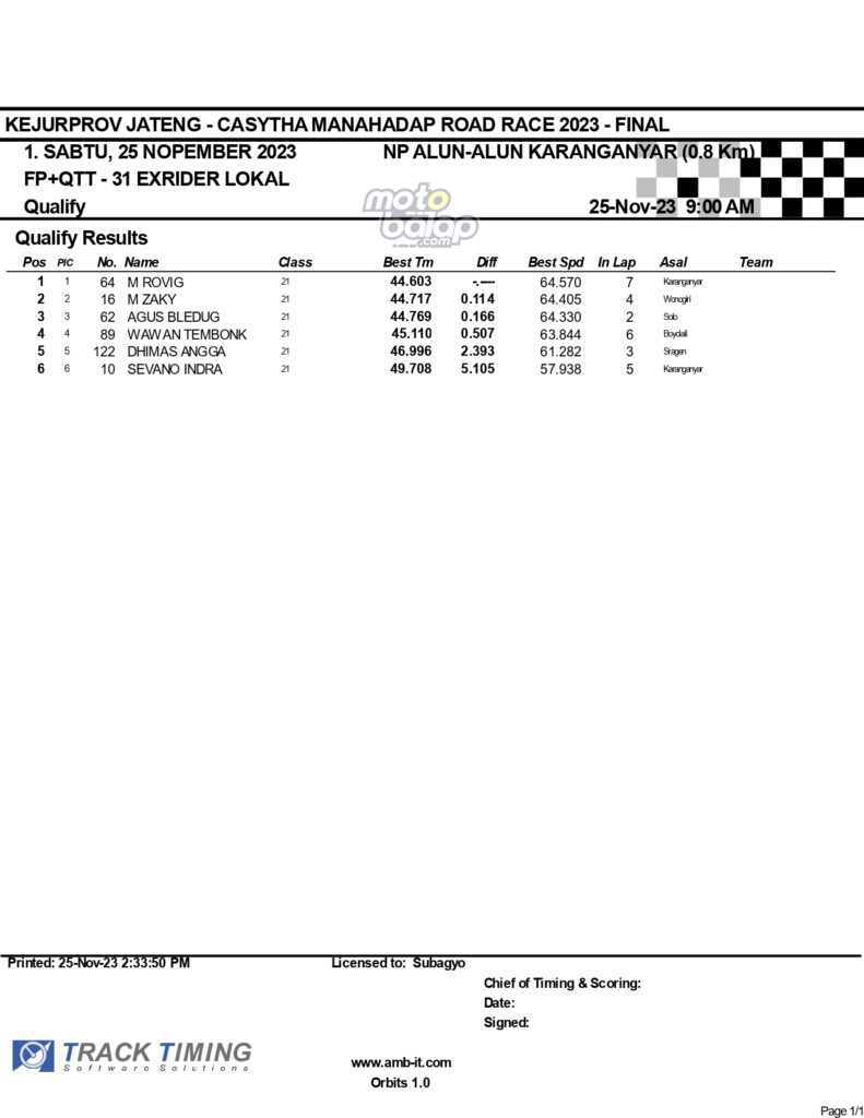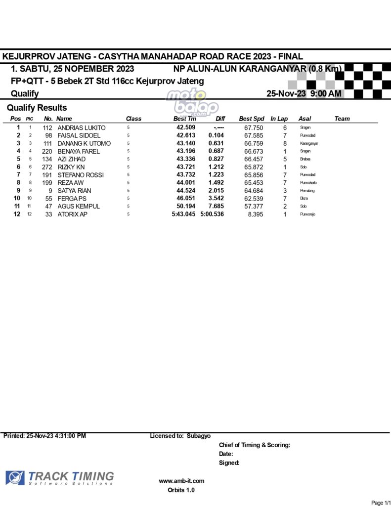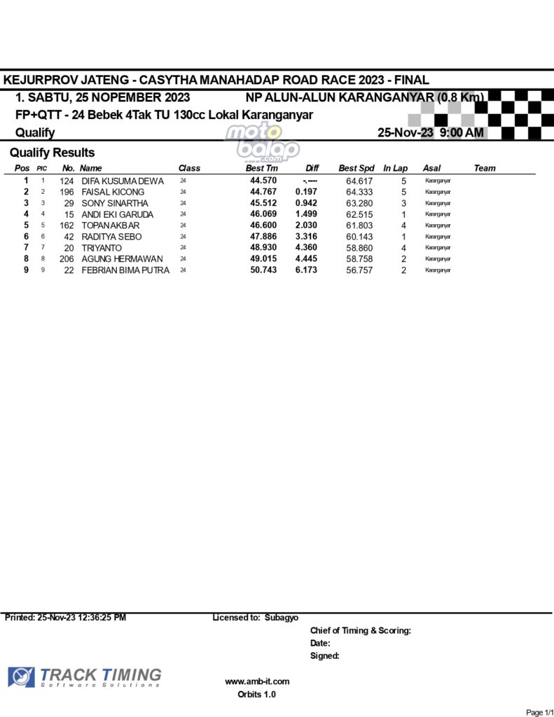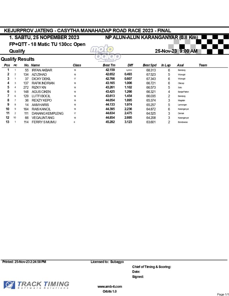 Dari keselurahan kelas yang dilombakan, di bawah ini merupakan Hasil Lengkap QTT Kejurprov Jateng Casytha Manahadap Road Race 2023 Karanganyar adalah sebagai berikut: