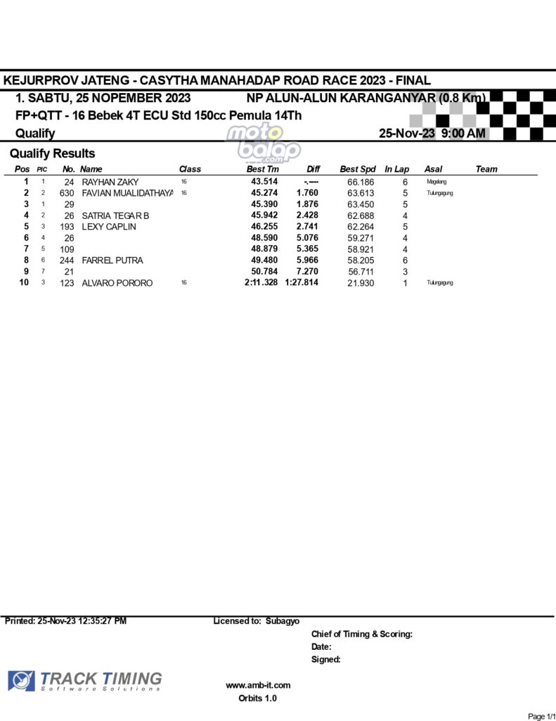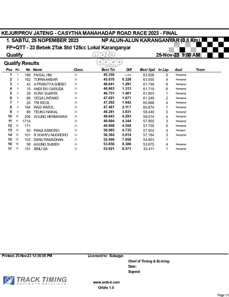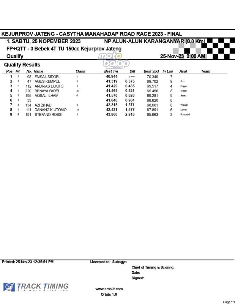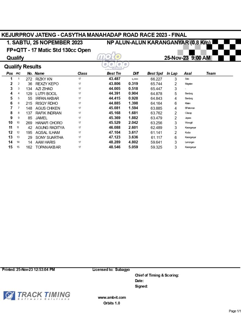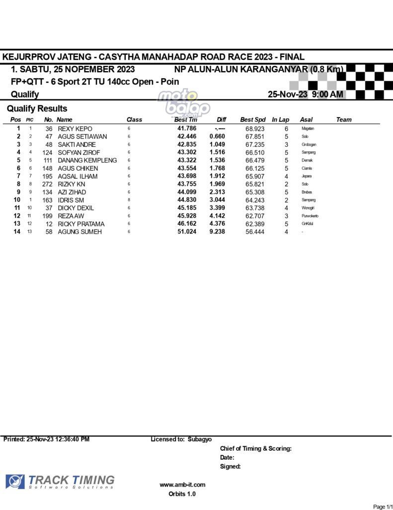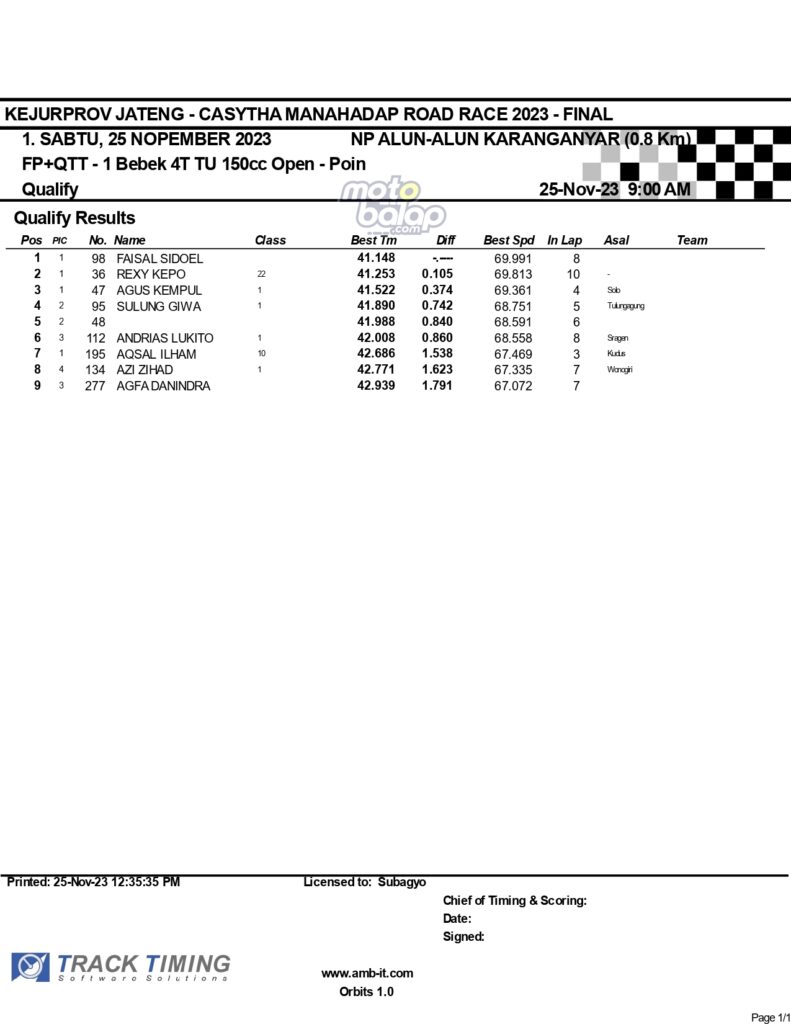 Dari keselurahan kelas yang dilombakan, di bawah ini merupakan Hasil Lengkap QTT Kejurprov Jateng Casytha Manahadap Road Race 2023 Karanganyar adalah sebagai berikut: