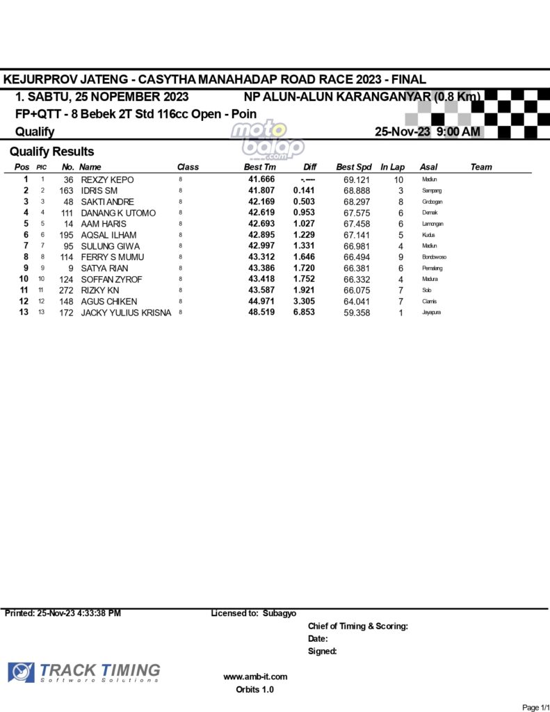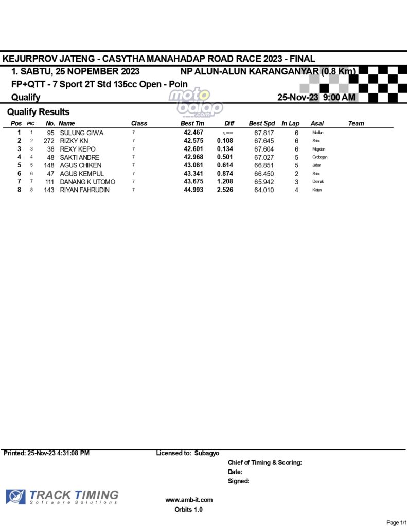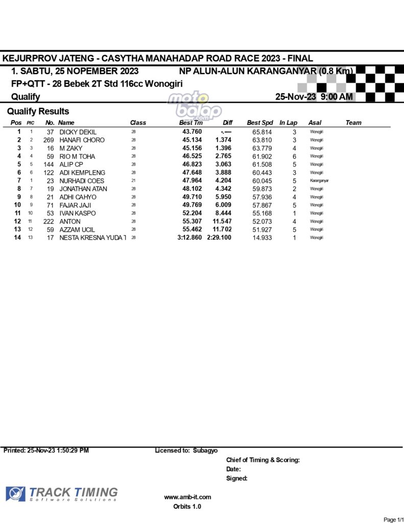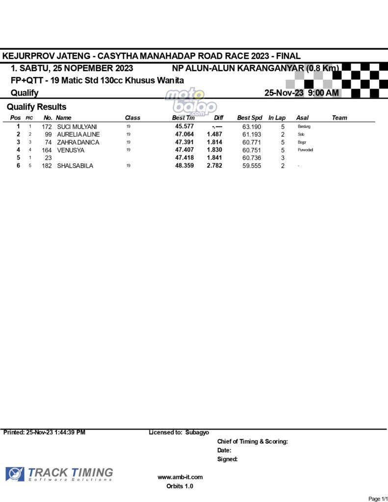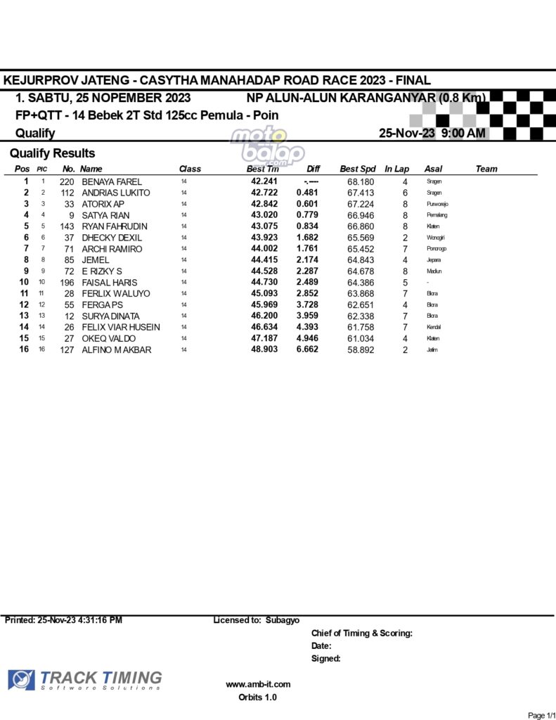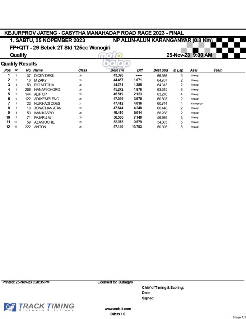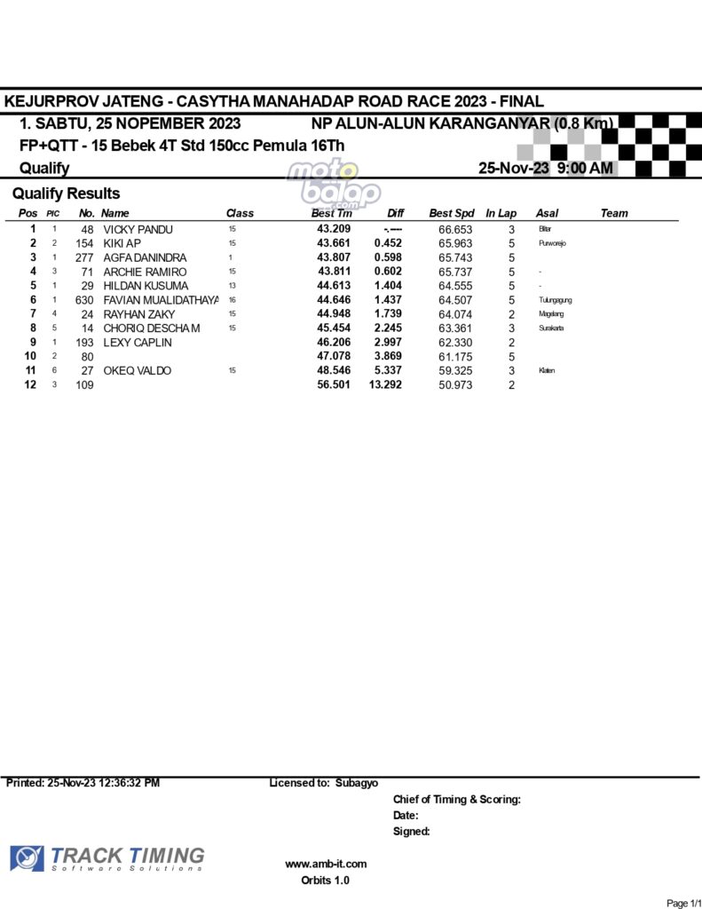 Dari keselurahan kelas yang dilombakan, di bawah ini merupakan Hasil Lengkap QTT Kejurprov Jateng Casytha Manahadap Road Race 2023 Karanganyar adalah sebagai berikut: