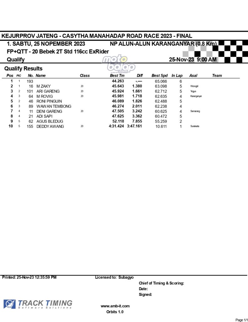 MOTOBALAP.COM – Kejuaraan Balap Motor bertajuk Kejurprov Jateng Casytha Manahadap Road Race 2023 diawali dengan sesi QTT yang berlangsung di sirkuit non permanen Alun-alum Karanganyar, Jawa Tengah, Sabtu (25/11/2023).